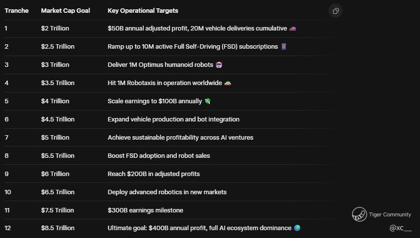 Diving deeper into the nitty-gritty: The plan's structured in 12 tranches of stock awards, each unlocked by pairing massive market cap jumps with operational feats. Current market cap? Around $1.5 trillion. The biggest beast? Hitting $8.5 trillion— that's over 5x today's value! 😱 But it's not just about the bucks; it's robots, rides, and revenue galore. Here's a breakdown of those killer milestones in a handy table: