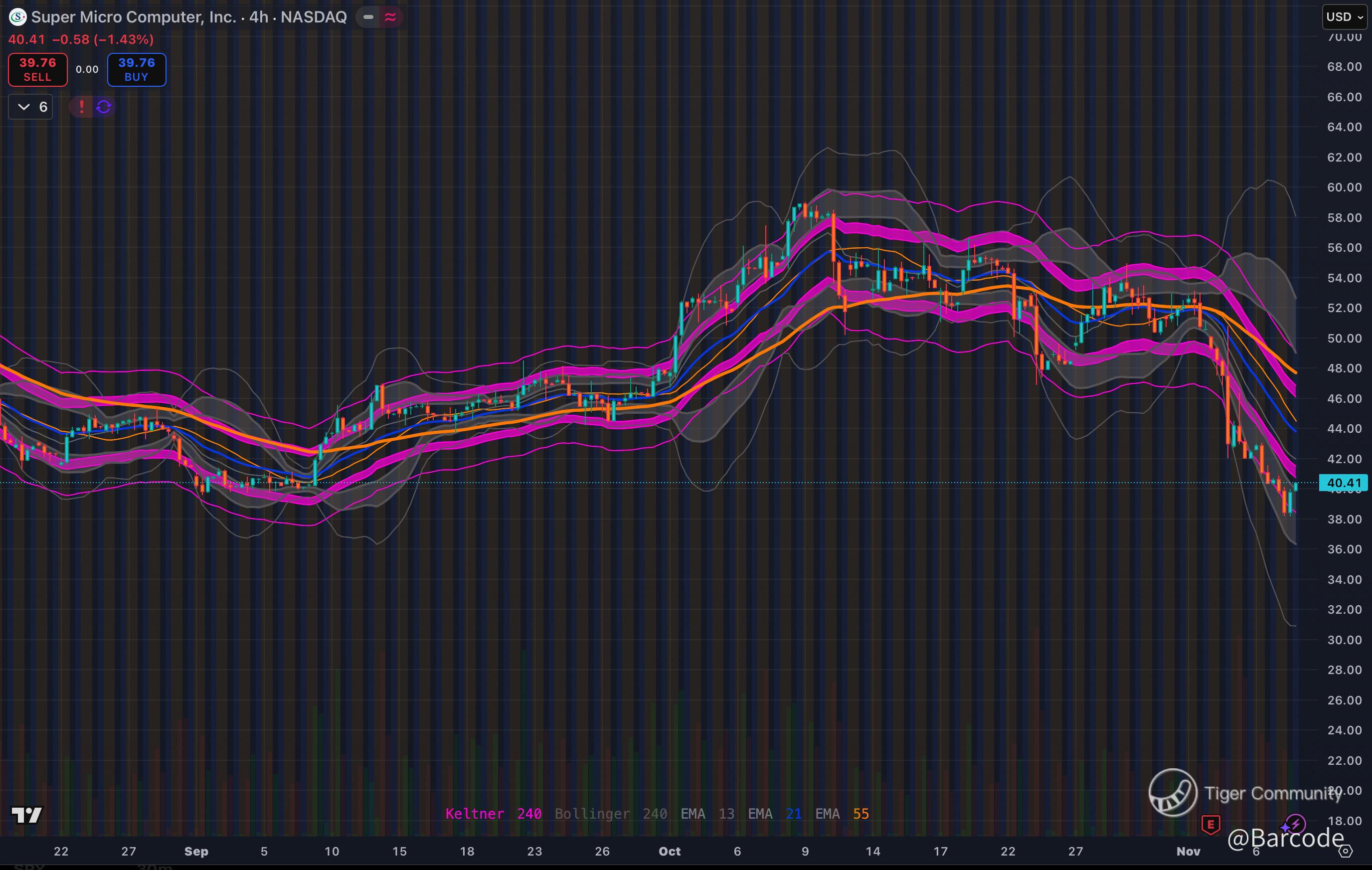SMCI just broke below the $40 level, a key support since May. The stock is down 3.8% today, extending its five-day losing streak, but still up 27% year-to-date! Price momentum is rolling over post-earnings, and the next key zone sits near $36–$37, where buyers previously defended the trend.