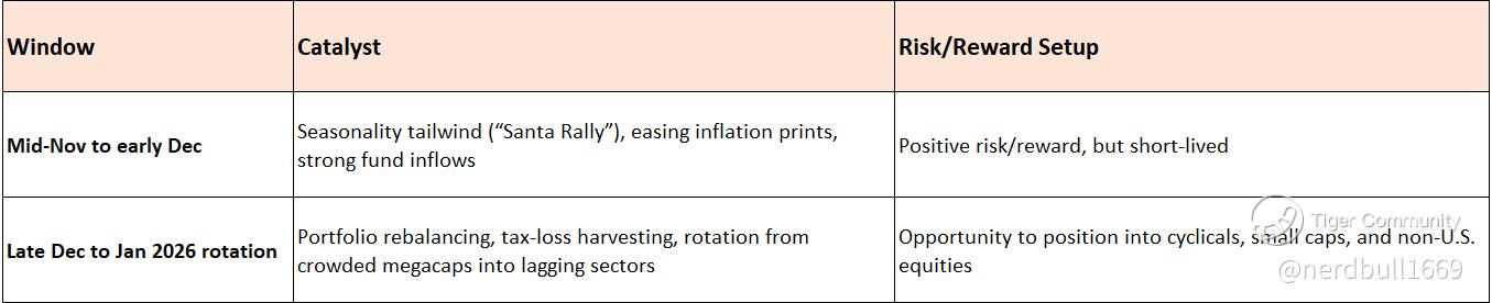 Historically, these two periods tend to favor high-beta and growth assets, but volatility spikes afterward as the market re-prices rate expectations and earnings for the new year.