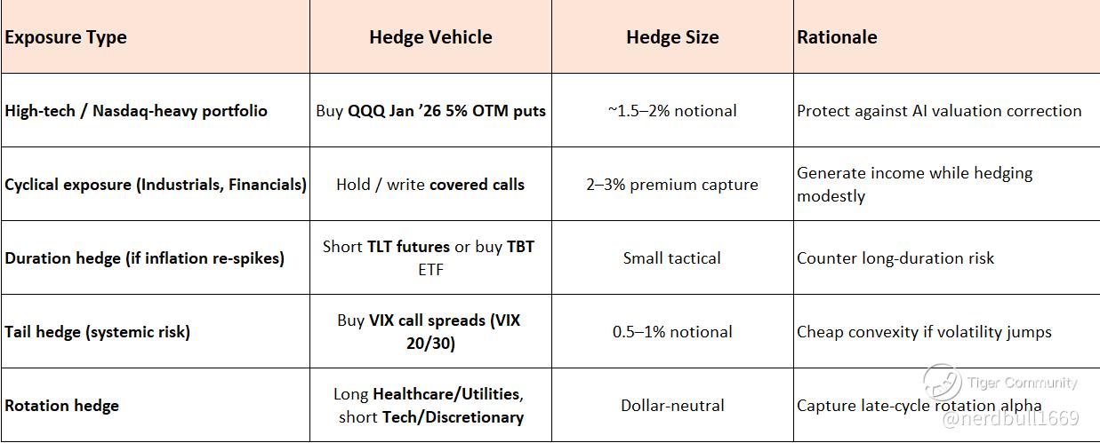 Use index puts on the S&P 500 or Nasdaq 100 (short-dated) as tactical hedges.