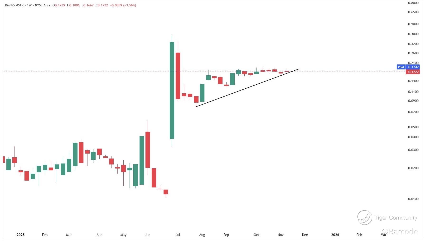 $BitMine Immersion Technologies Inc.(BMNR)$ $Strategy(MSTR)$ $Grayscale Ethereum Mini Trust ETF(ETH)$ 📉 $BMNR is coiled at the $33 pressure line and this $30 compression is signalling a decisive move ahead. The structure remains weak on higher timeframes and the $BMNR / $MSTR ratio on the weekly shows an ascending triangle that often appears before volatility expands.