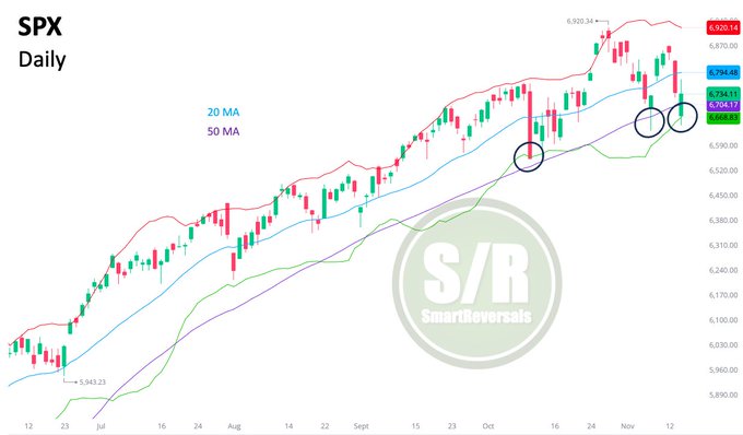 This time with a scary gap down that was filled quickly, given once again to the confluence of the 50DMA and the lower Bollinger Band. Notably, this specific technical setup has now occurred for the third time on a Friday.