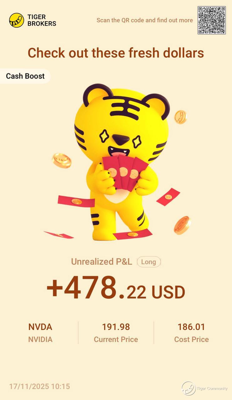 $NVIDIA(NVDA)$ Took some profit and still bullish! NVDA's moat is solid – even if the AI bubble cools, its sales and market share could still grow. Plus, grabbed the sweet SGD 688 Cash Boost from the contra688 offer. Perfect timing for more trades!