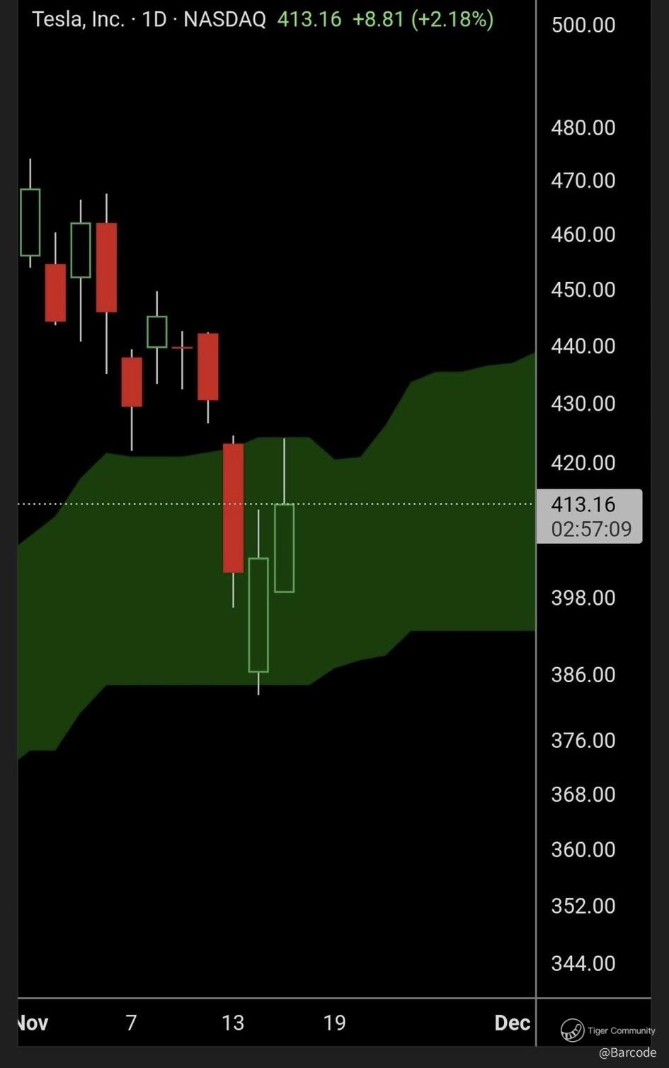 - Kiwi TigressΒ·11-18TOPHonestly this whole move feels wild because $TSLA sitting inside that cloud looked like nothing was happening then it ripped straight through $420.77 and the way it held green while tech went red makes it feel like the flow wanted this. I keep staring at that $398.25 pivot because the reaction was so sharp. Kinda feels like traders are crowding the same levels and that $425.8 tap you mentioned is the next obvious magnet. Iβm just mapping scenarios and watching how the volatility keeps shifting because itβs not fading at all1Report