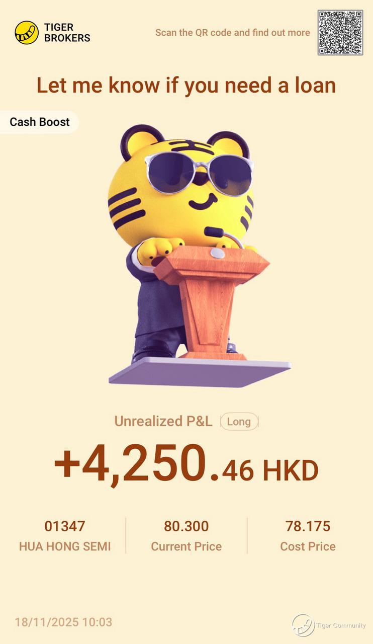 $HUA HONG SEMI(01347)$ Go! Huahong isn't just rising—it's aiming for the peak! Booked some profits and kept the momentum with a margin. Perfectly timed with the Contra688 offer; those free vouchers are a total booster for firing up more trades! Bullish in the future.