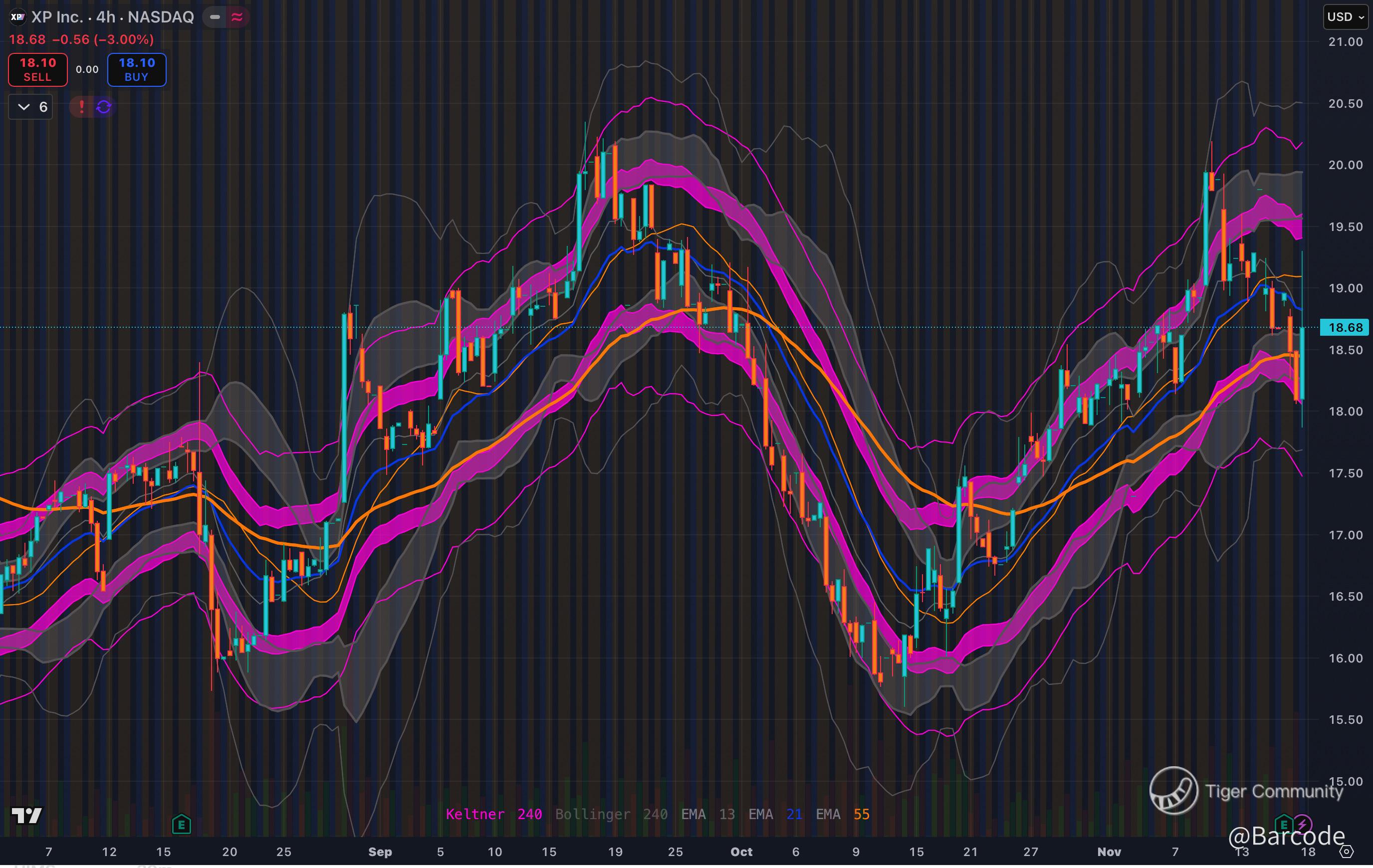 On the 4H chart, I see XP trading within a rising channel that has been intact since the October low near 16.20. The move into 19.80 created a micro double top and price has since pulled back into the centre of the Keltner structure. This is a consolidation phase, not a breakdown. The broader rhythm shows impulsive rallies followed by controlled retracements.