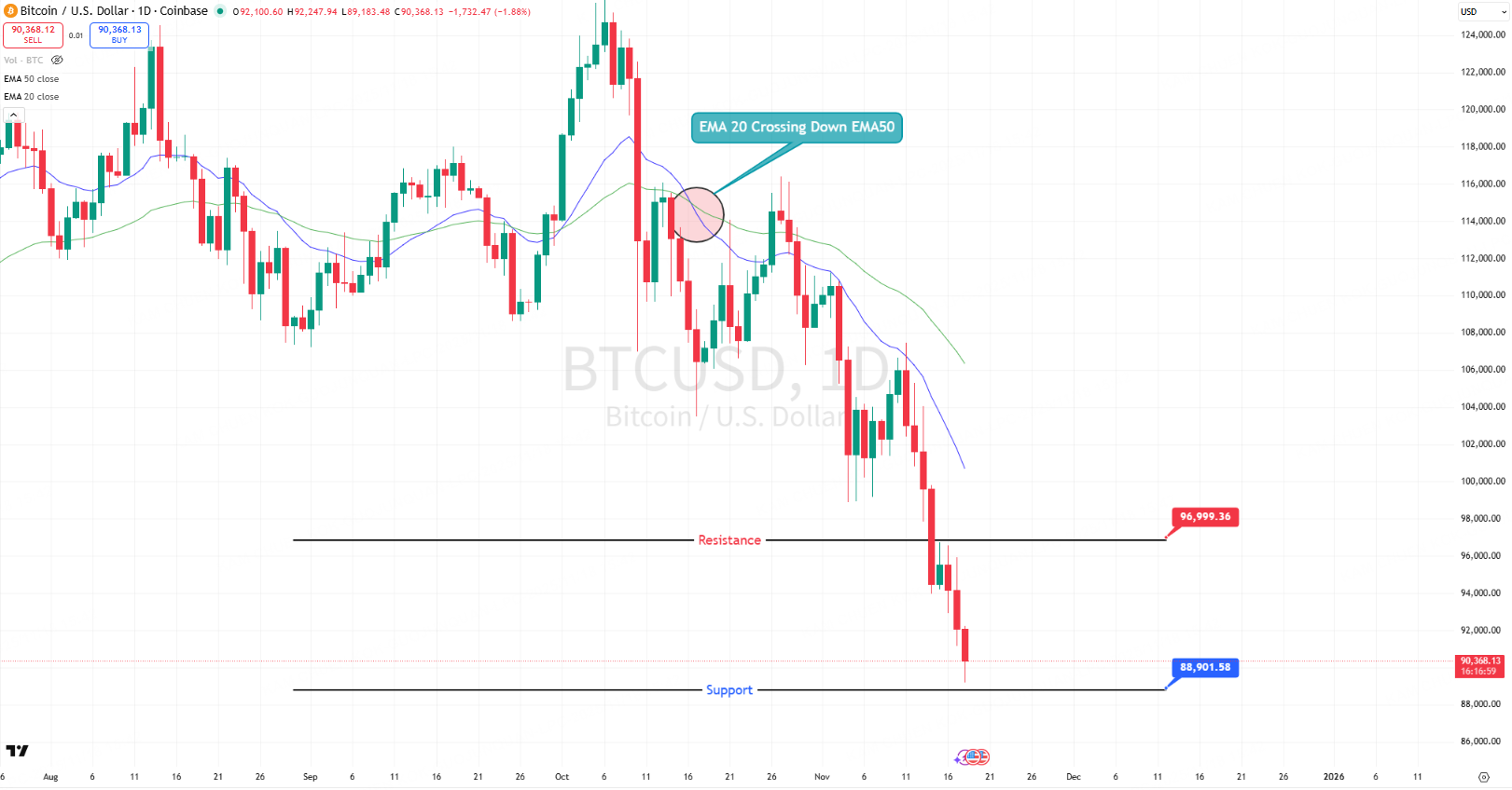 BTC cryptocurrency dropped below $94,000 amid profit-taking pressure and technical resistance.