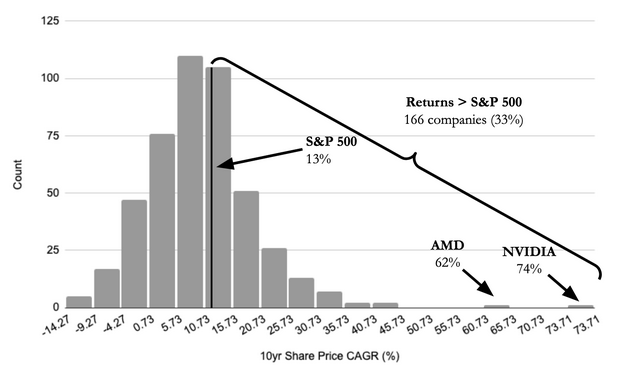 From 2015-2025, only 166 companies in the S&P 500 $S&P 500(.SPX)$ grew their share price by more than 13% per year (beating the index).