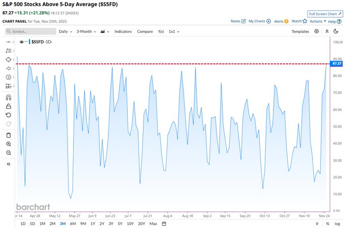 More than 87% of S&P 500 stocks are now trading above their 5-day moving average, the most since April π¨π
