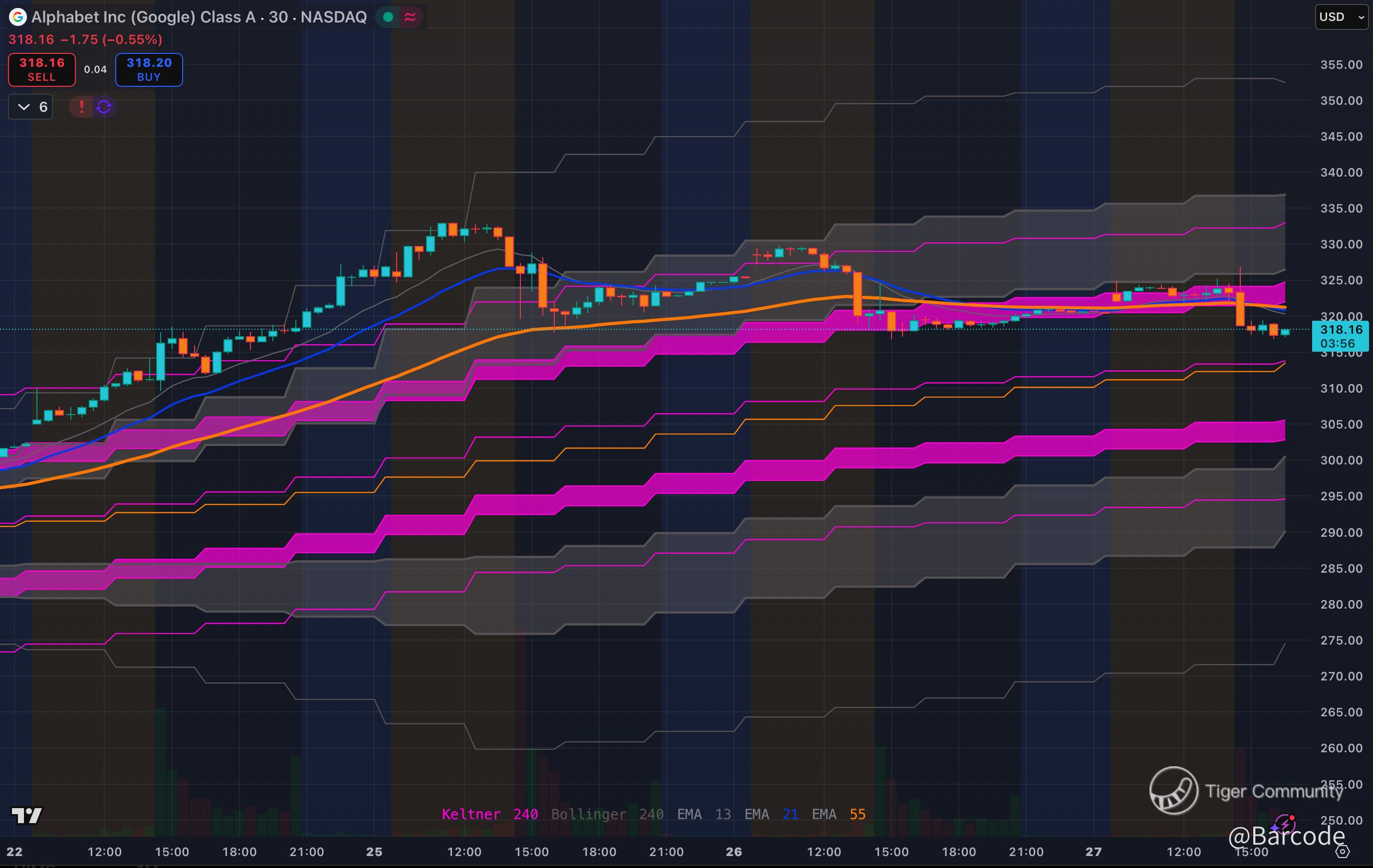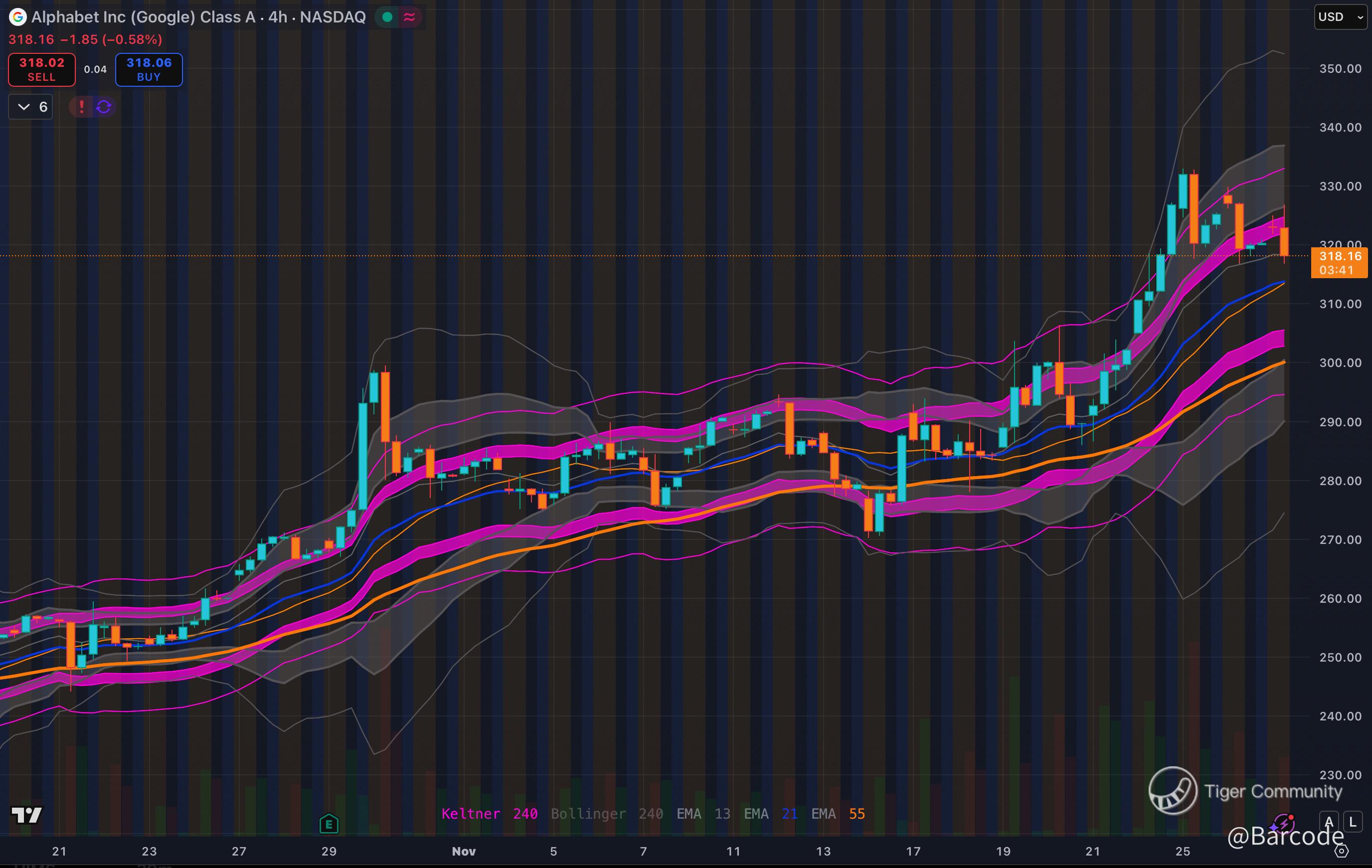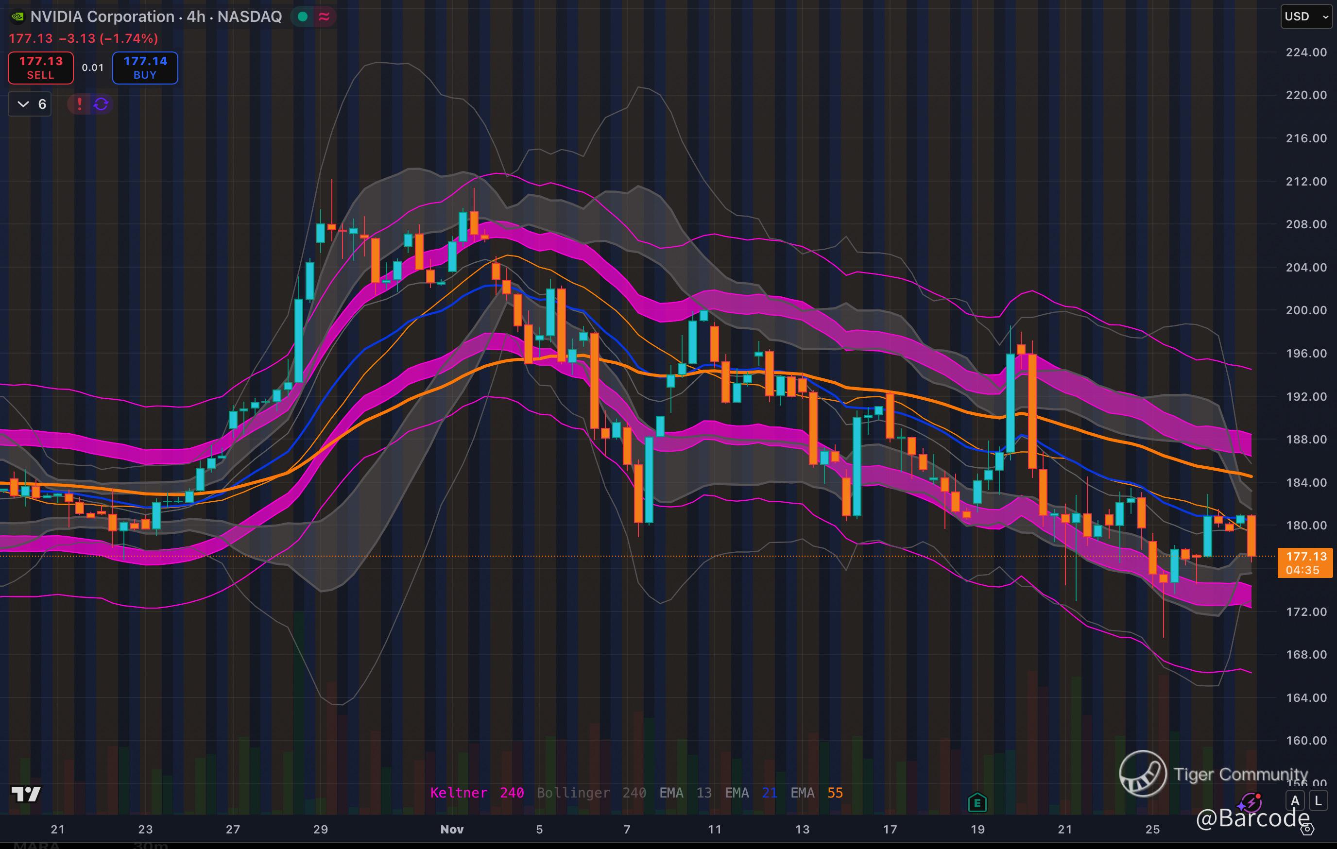 The 4H structure maps as a descending wedge with compression building between the Keltner Bands and the 55 EMA near $184.20. The October peak at $207 remains the macro ceiling. Price has tested the lower rail around $172.50 to $172.93 three times this week, and each probe stalled. That area aligns with volume weighted average price floors and serves as the strongest short term support.
