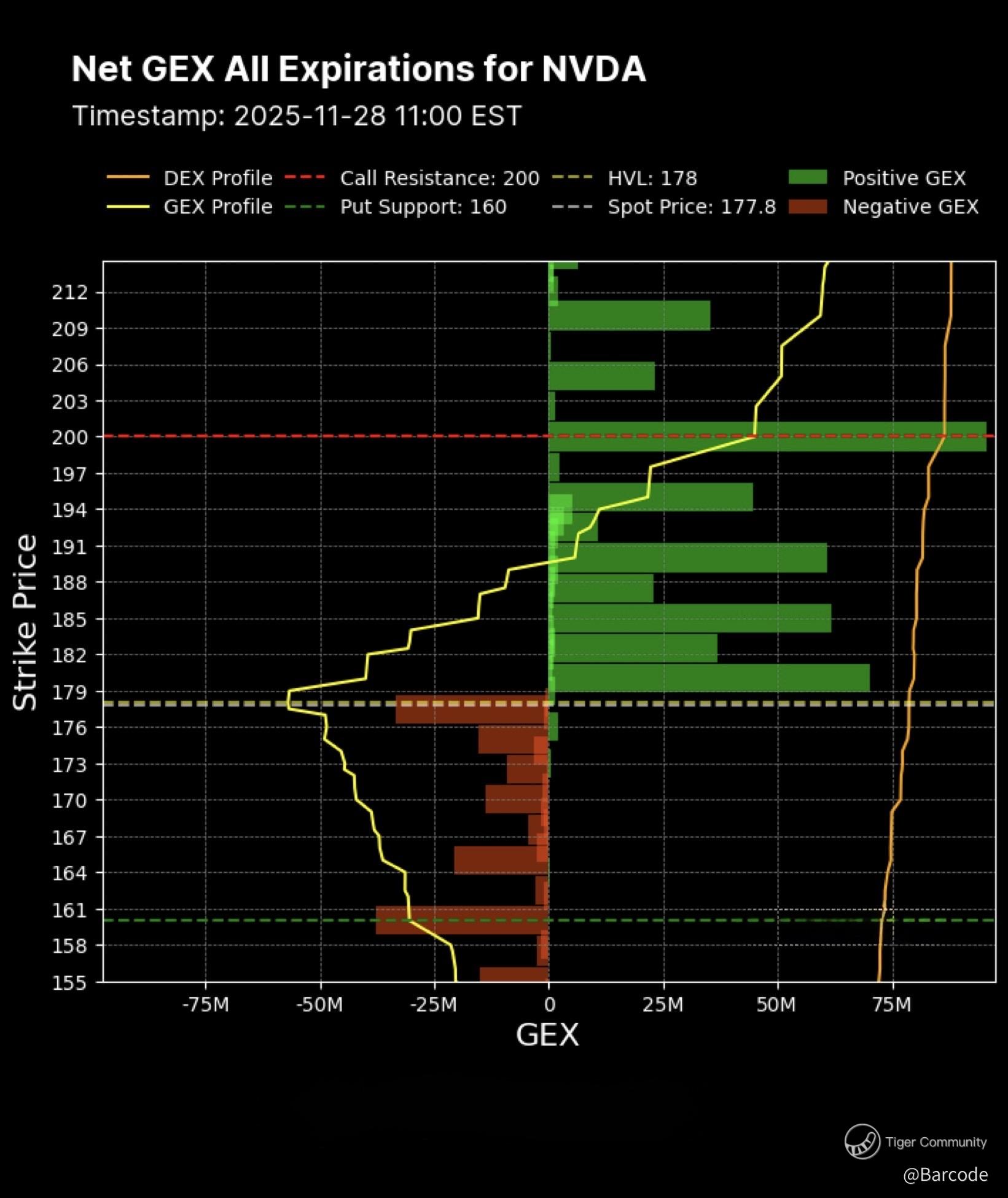 A break above $184.20 followed by a push into $189.50 would be my first confirmation that momentum is turning. A move beneath $172.50 with rising IV would shift my expectations toward a deeper retest of the $160 gamma wall.