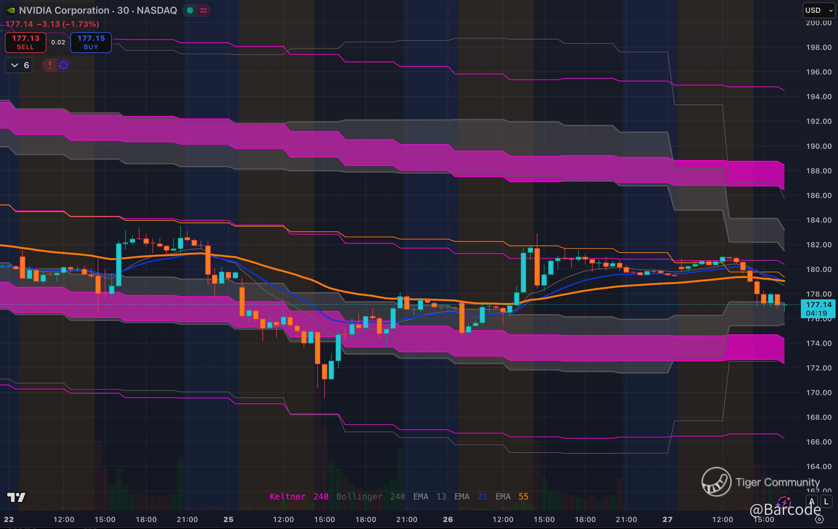 On the 30m chart Iβm seeing clear signs of downside exhaustion. Each push lower has printed diminishing volume, which usually marks corrective maturity rather than the start of a fresh trend. The Keltner midline around $178.40 keeps acting as the intraday pivot. RSI divergence at 38 is also building. I treat this as reactive selling with decaying energy rather than directional conviction.