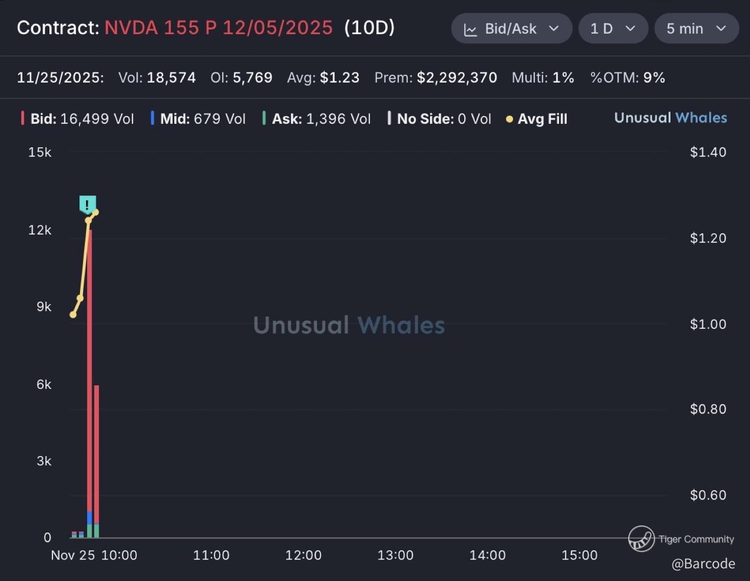 Put flow also rose on the Dec 5 $155P where a whale closed roughly $2M in premium. That is not a posture you take if you expect a structural breakdown. Dark pool indications add weight to the picture. Friday printed $3.38B in NVDA off exchange flows, which exceeded even $QQQ. A 5.2M share block at $181.15 shows institutional conviction at the higher end of the current band. NVDA also led single stock open interest builds ahead of $TSLA and $AMZN, according to Unusual Whales. The market is staging for movement, not withdrawal.