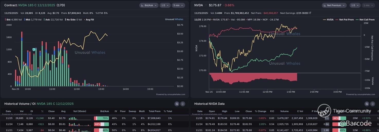 Gamma exposure flipped positive intraday, which keeps dealers positioned to support call driven drift instead of reinforcing put walls. Net GEX fell earlier in the week but stabilised today. DEX also eased, which removes hedging friction from the near term tape. Iβm watching flow clusters at $180 and $185. More than 26,000 contracts traded on the $185C line last Thursday with institutions rotating into the Dec 12 extension. That line now carries over $8.2M in notional exposure. The traders who entered early earned around 50% at peak. Tomorrowβs open interest tells me whether they hold, roll or unwind.