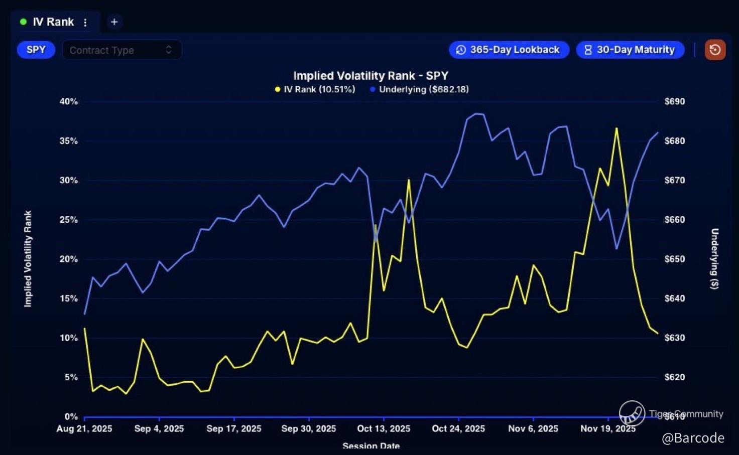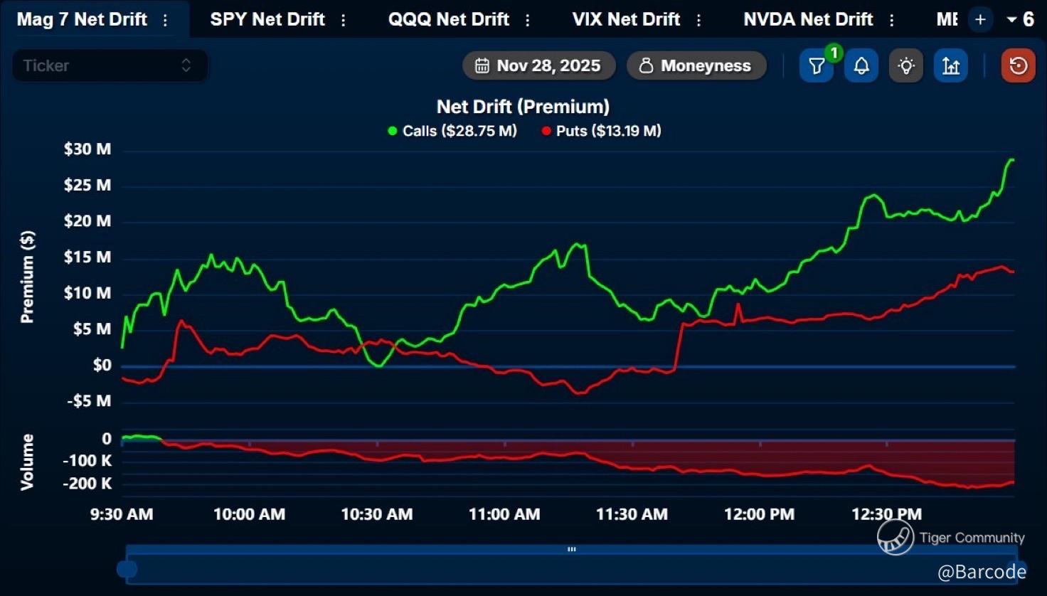 Mag 7 net drift printed USD 28.75M in call premium versus USD 13.19M in puts which confirmed broad upside priors. $SPY IV rank dropped to 10.5%, the lowest in over a month. Low IV combined with long gamma generally results in a controlled grind higher.
