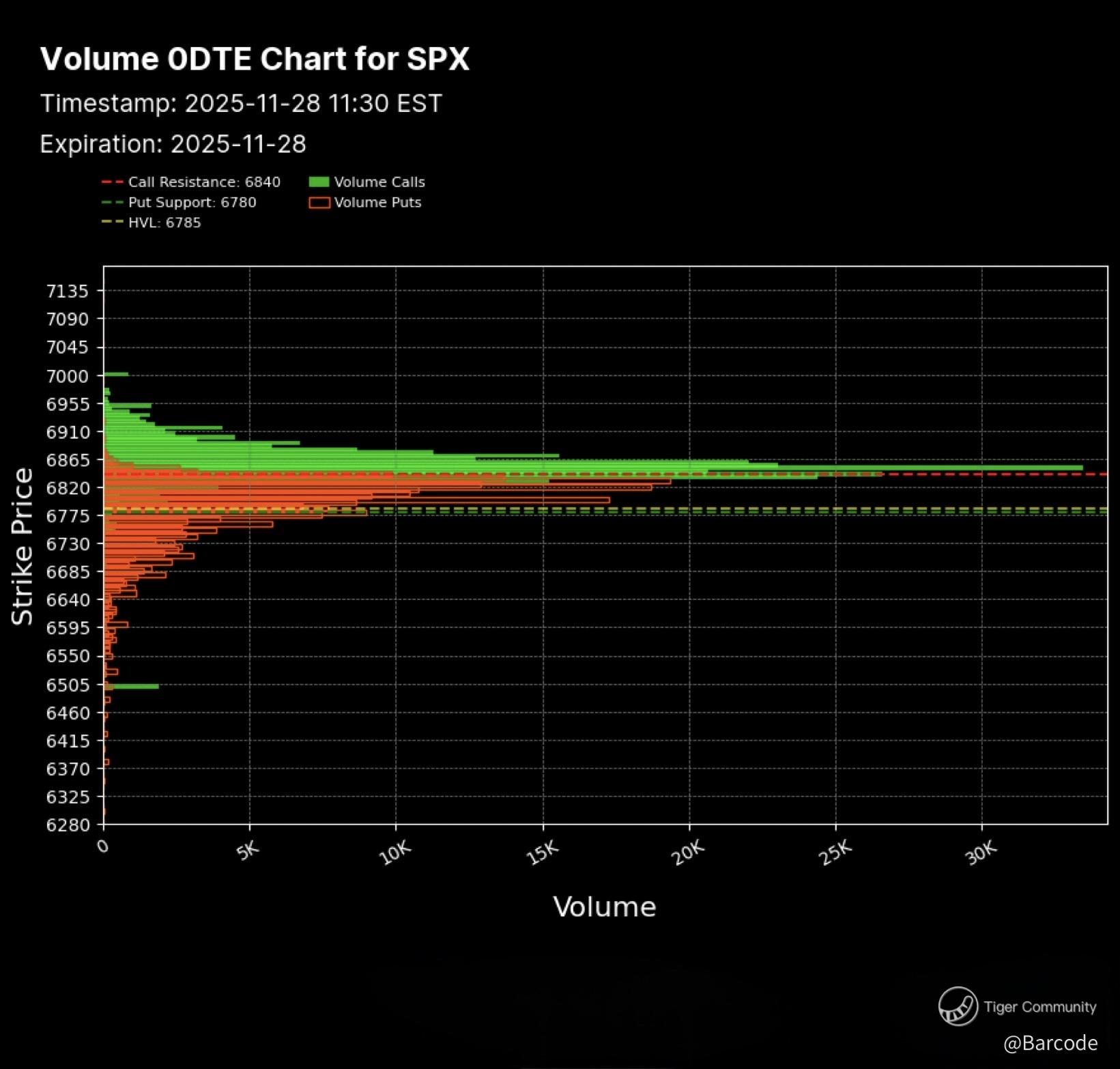 I tracked flow across the complex and the message was decisive. The S&P 500 sat in a clean positive gamma regime with dealer exposure concentrated around 6840 which kept price action pinned. The 0DTE volume map showed heavy call stacking near 6840 and put support at 6780. The HVL at 6785 acted as the sessionโs centre of gravity.