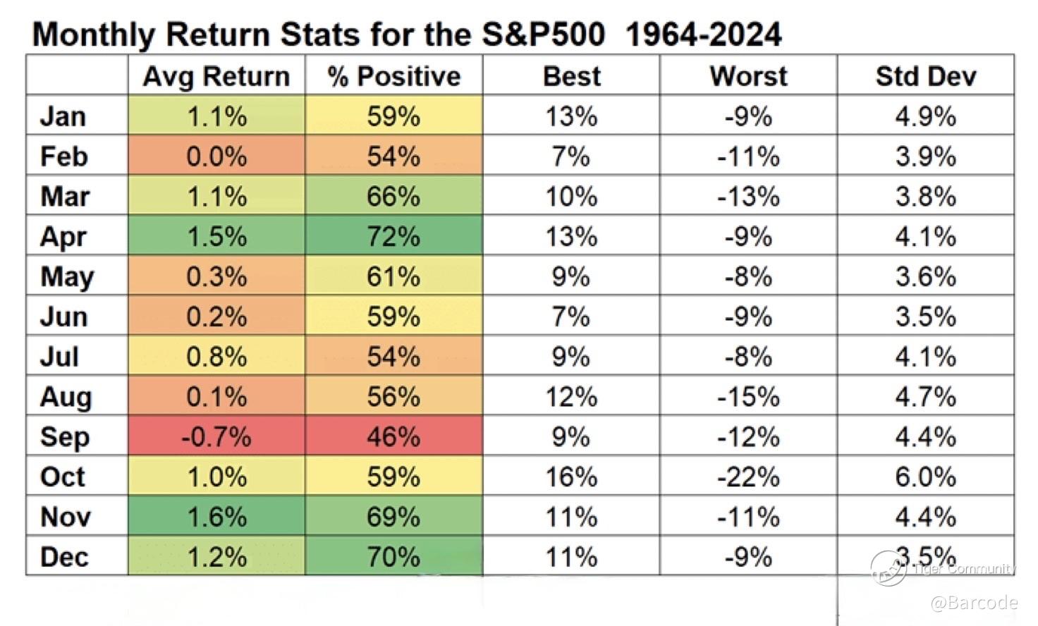 I always treat seasonality as a structural guide rather than a signal, but the long term data still shapes how I frame risk into month end. The S&P500 table covering 1964 to 2024 shows the pattern clearly. November has delivered an average return of 1.6% with a 69% positive hit rate and a best month move of 11%. December sits even stronger with a 1.2% average return and a 70% positive rate. Both months carry moderate volatility with standard deviations under 4.5%.