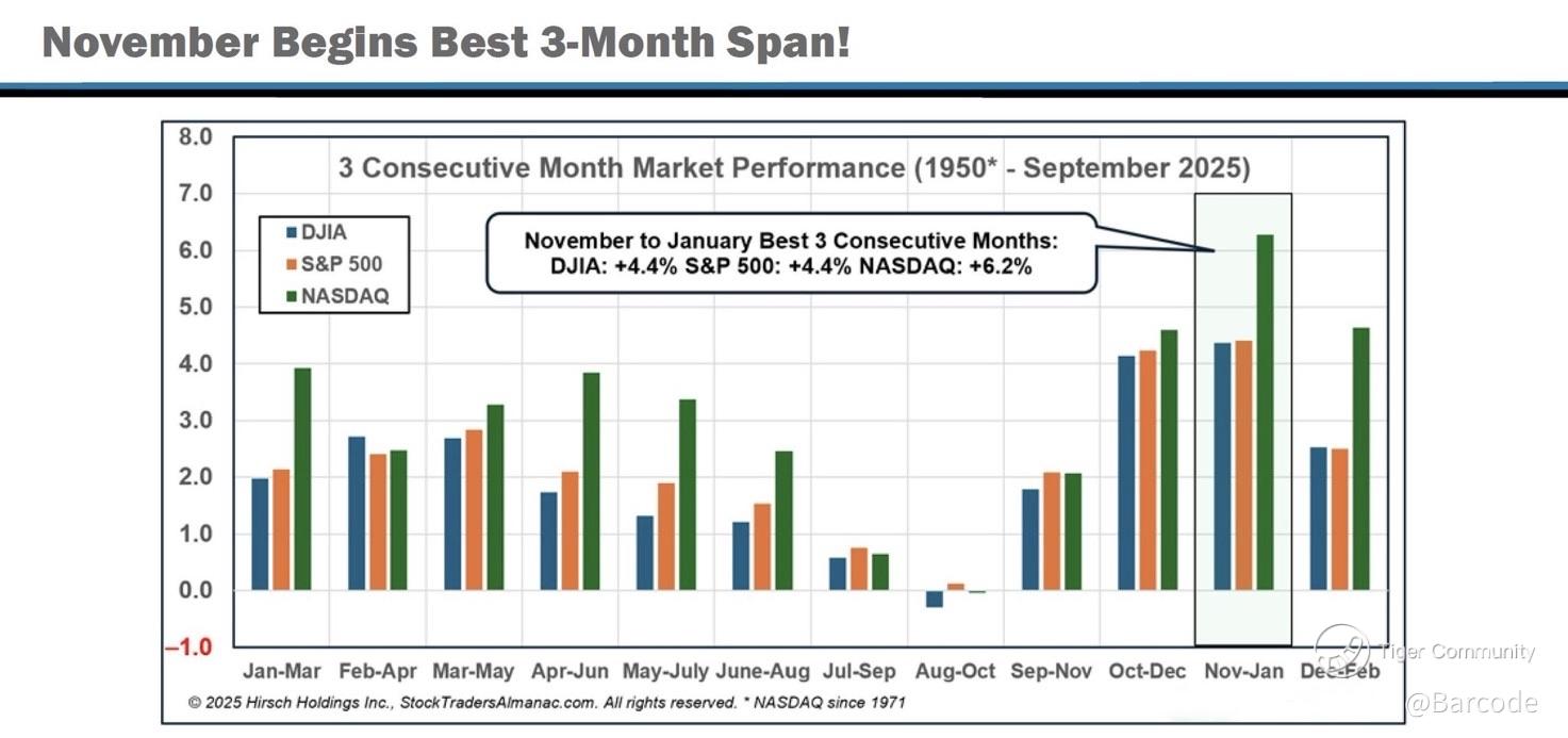 Fed expectations firmed with 68% odds of a December cut and 87% odds of a February 2026 cut. QT ends 01 December and the Treasury will rebuild the TGA by USD 150B in Q1. Hedge funds lifted exposure, CTAs flipped fully long, and ETF flows remained constructive. Seasonality now moves into one of the strongest windows of the year with December historically returning +1.2% with a 70% probability of finishing positive.