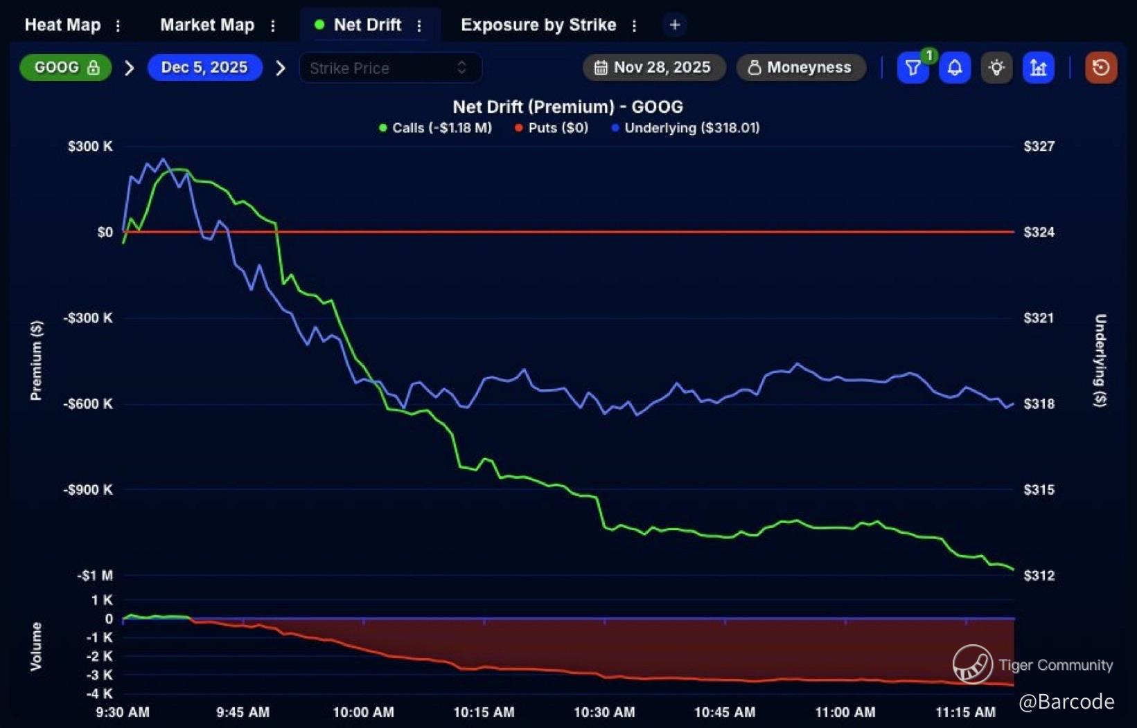 $GOOG showed the opposite pattern. More than USD 1.1M in single leg calls were sold while price dropped more than seven dollars from the open. Net drift stayed negative throughout the morning and early afternoon.