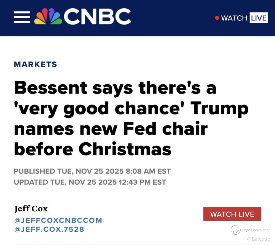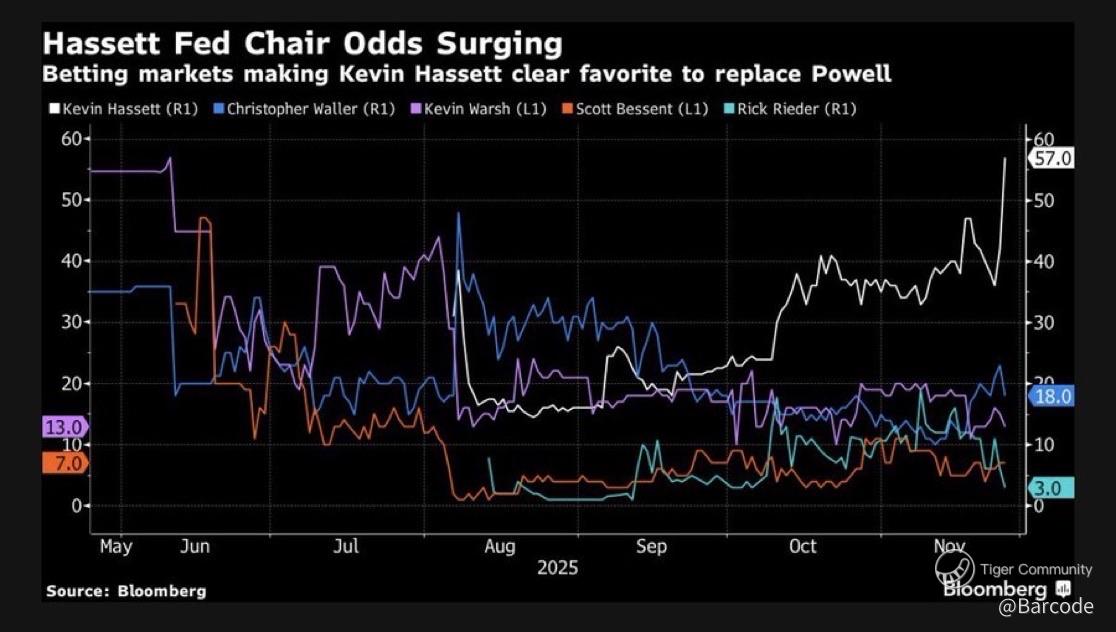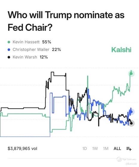 Trump confirmed on 30Nov25 that he has chosen the next Fed Chair. Treasury Secretary Bessent narrowed the finalist list to Hassett, Waller, Warsh, Rieder, and Bowman, signalling a pre-Christmas announcement. Hassett dominates the prediction landscape. Polymarket prints 57% on 01Dec25 with over 544K USD in volume, up from 52% late November. Kalshi holds 78%, a 23% weekly jump. Bloomberg tracked him at 56% on 28Nov25. His tenure within Trump’s economic structure positions him firmly behind a sub 4% rate stance and a growth-first approach. The post-shutdown interview yield dip below 4% on the 10-year confirms how sensitive duration markets are to his policy alignment.
