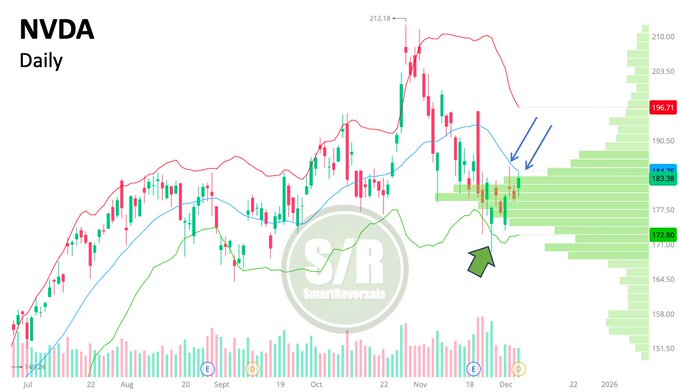 Today, the bullish case is getting traction, the bounce from the lower Bollinger band has reached its first natural destination: the 20DMA, a rejection is likely, but the volume shelf is setting an interesting launchpad.