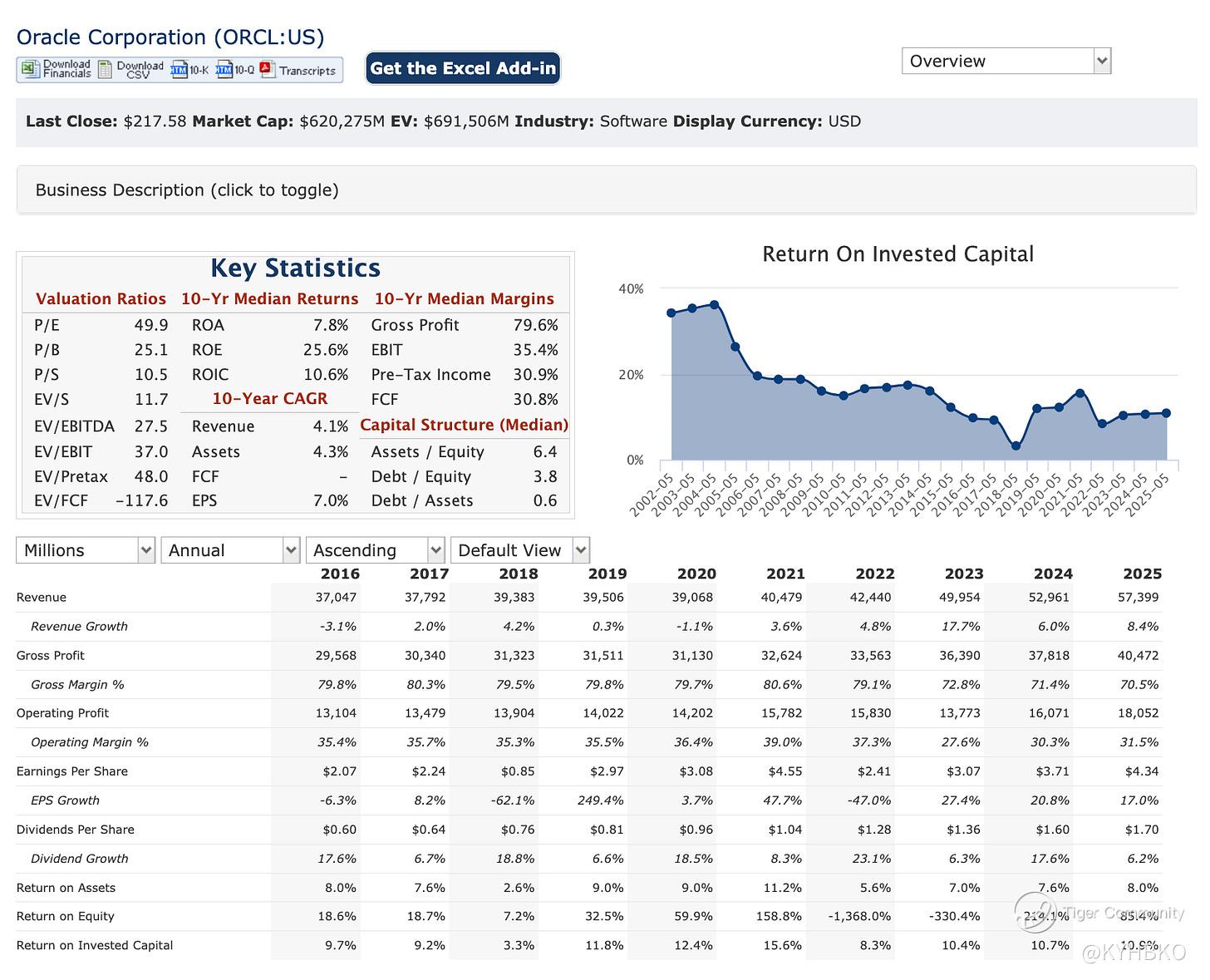 Oracle’s P/E (49.9) is currently higher than the direct Software industry average approx 31.5-34.0. This multiple suggests that investors are pricing in strong future growth expectations, primarily driven by the company’s aggressive transition to its high-margin Cloud Infrastructure (OCI) and Fusion Cloud ERP platforms. (Source: Gemini)