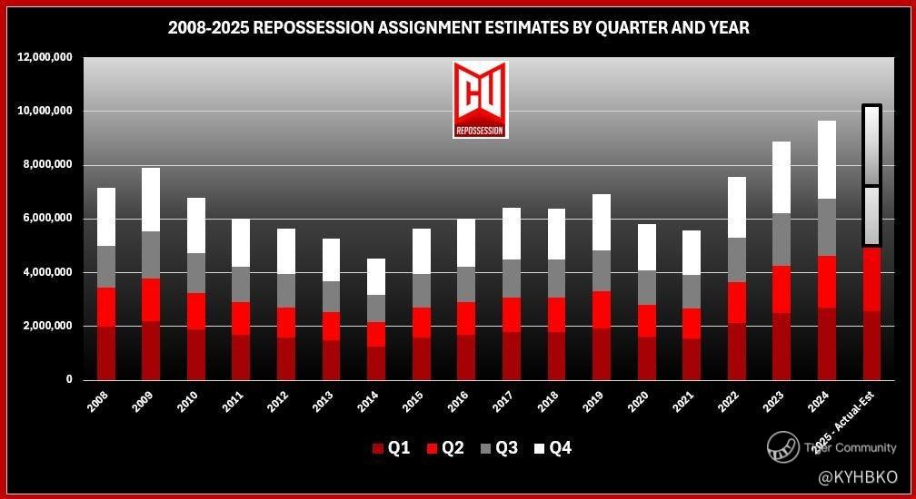 Car repossessions are on track to hit 3 million in 2025, matching Great Recession levels and making it the third-worst year on record. Q2 alone saw 706,393 repossessions, the largest Q2 volume ever recorded. Auto loan delinquencies are at their highest since 2010, with subprime rates at the worst since 1994.