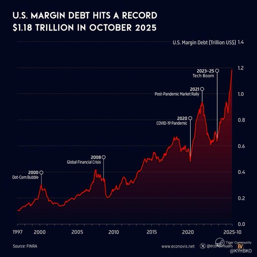 US margin debt spiked +45.2% YoY, to a record $1.18 TRILLION in October 2025. In the past, such an aggressive rise has been seen before major market tops. - X user Global Markets Investor