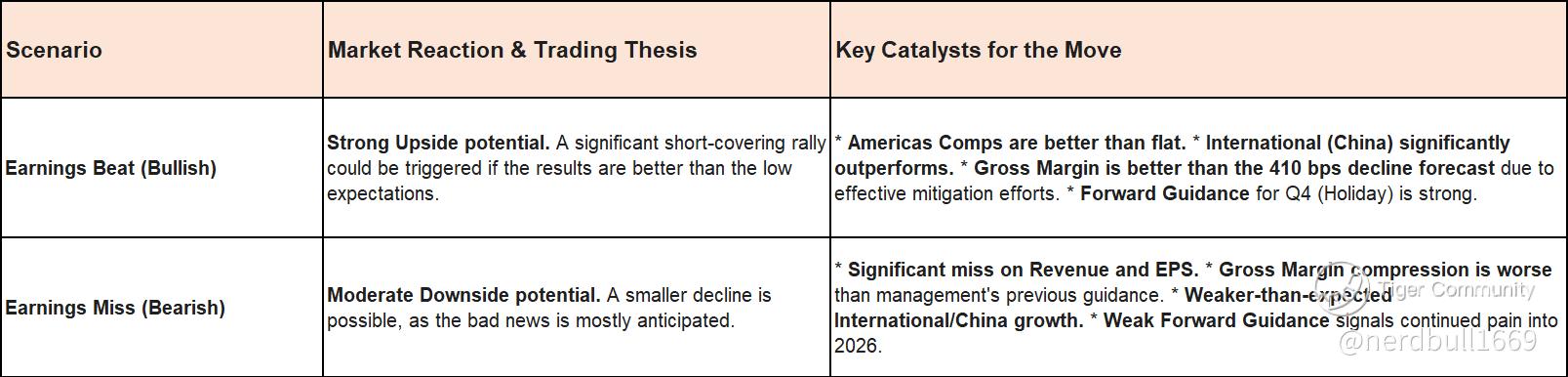 The market has priced in a potentially weak report, with implied volatility suggesting a 10% to 13% stock movement post-earnings. A better-than-feared result on gross margin or a beat on international growth could trigger a short-term rally.