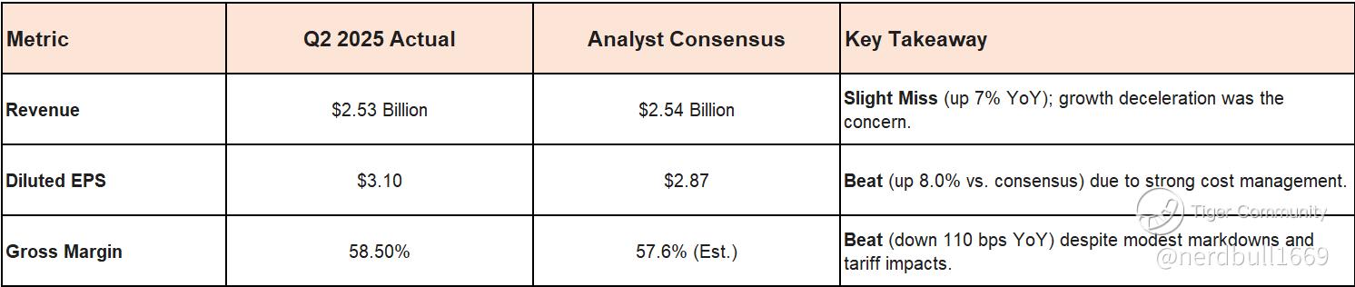 Lululemon's Q2 2025 results were a classic example of the market punishing a miss on the top line (revenue) and a disappointing outlook, even if the bottom line (EPS) beat expectations. The stock dropped significantly after the announcement, primarily due to concerns over its largest market and future profitability challenges.