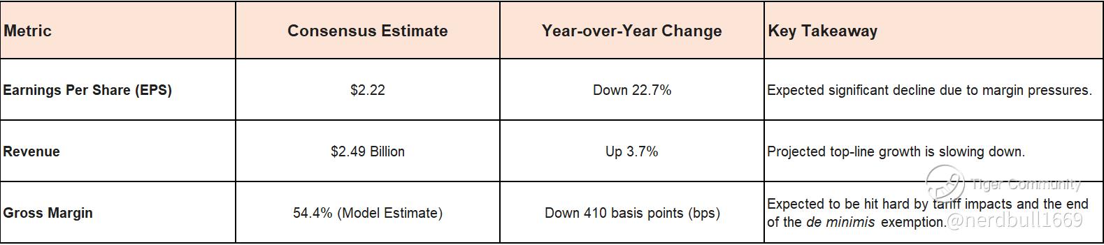 Key Headwinds: The anticipated drop in profitability is mainly driven by severe Gross Margin pressure. Management previously guided for a substantial year-over-year contraction of approximately 410 basis points due to the negative impact of higher tariffs and the removal of the de minimis duty exemption on U.S. imports.