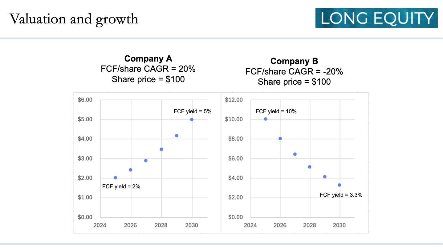 Second example: Two companies have the same FCF yield. Which is cheaper? The one with the highest growth rate.