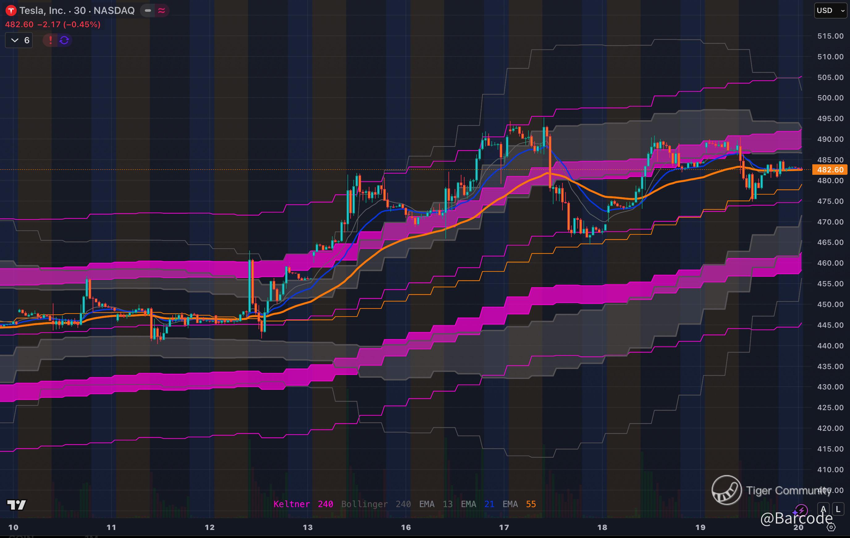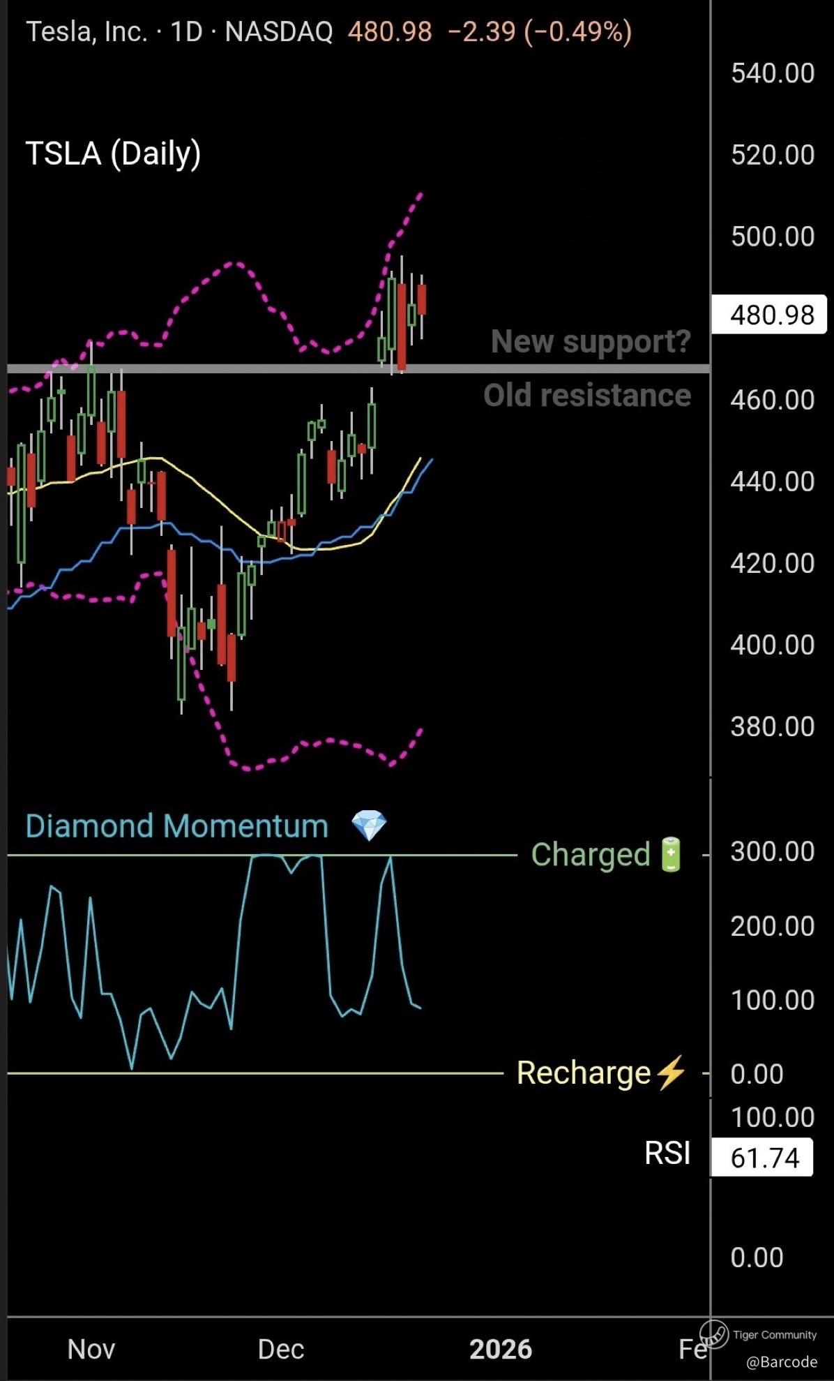 I’m treating this as a classic compression phase at elevated levels. $TSLA needs to hold $483.50 on a daily closing basis to keep the path toward $500 open. Price is tightening and needs to choose a direction. A hard loss of $477 would signal failed acceptance and, quite simply, no presents under the tree 🌲 for this name.
