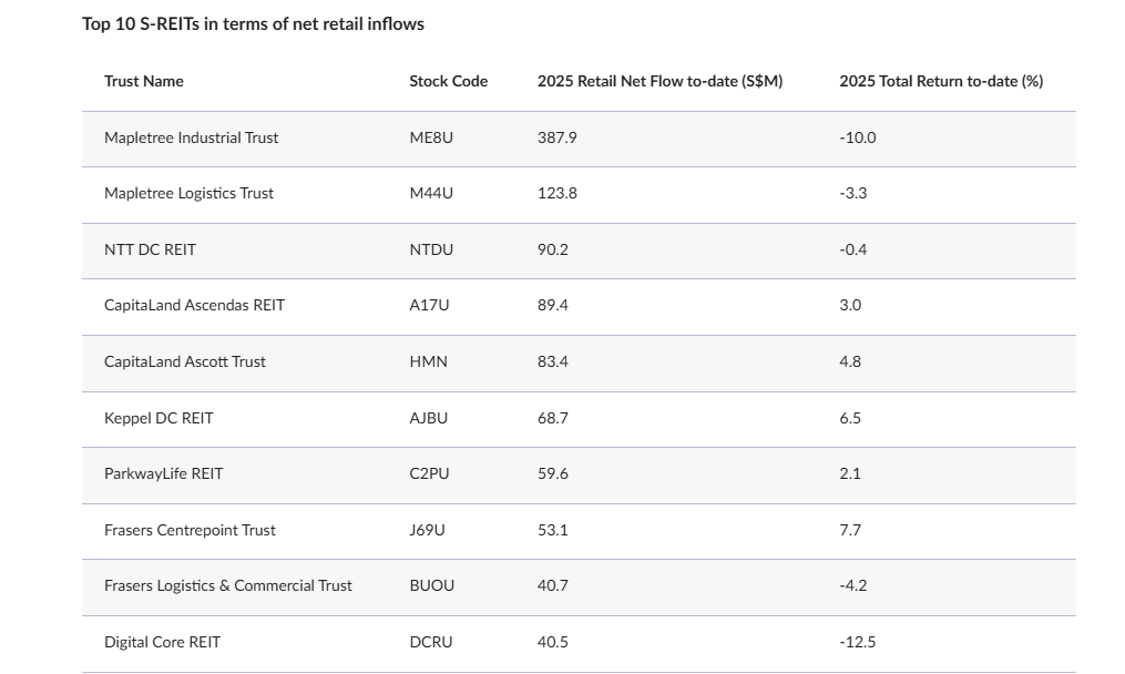 REIT Watch - 10 S-REITs which garnered over S$1 billion in total retail net inflows in 2025