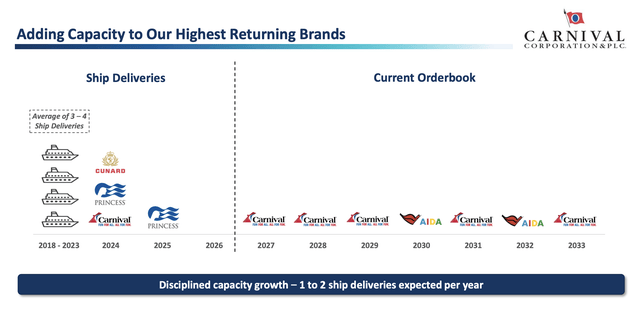 The cruise line only added one ship in 2025, and no capacity is planned for 2026, allowing for another year for debt repayments. The company has cut leverage down to ~3.5x adjusted EBITDA with debt down to only $26.5 billion and cash on hand of $1.8 billion.