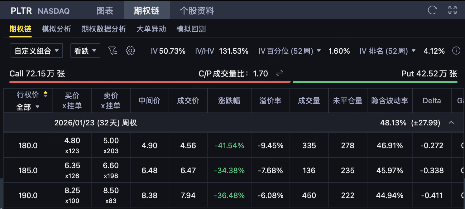 It is precisely under the superposition of this technical structure and valuation background that the logic of short-term short selling is more of a probabilistic choice at the transaction level than a negation of the company's long-term value. The current stock price is located in the upper half of the shock range, and the upward trend requires new catalysis and stronger capital promotion, while the resistance from the downward pullback/retracement to the center of the range is relatively smaller. Buy one that expires in one monthPut, is essentially a game of shock and fall back. The option price of 180 is close to the central axis of the shock range in the past two months. Once the price falls from the high level, the option Delta will be significantly enlarged. At the same time, the one-month period can cover the 2-4-week adjustment rhythm that has occurred many times before, making the time value loss relatively matches the expected pullback/retracement window.