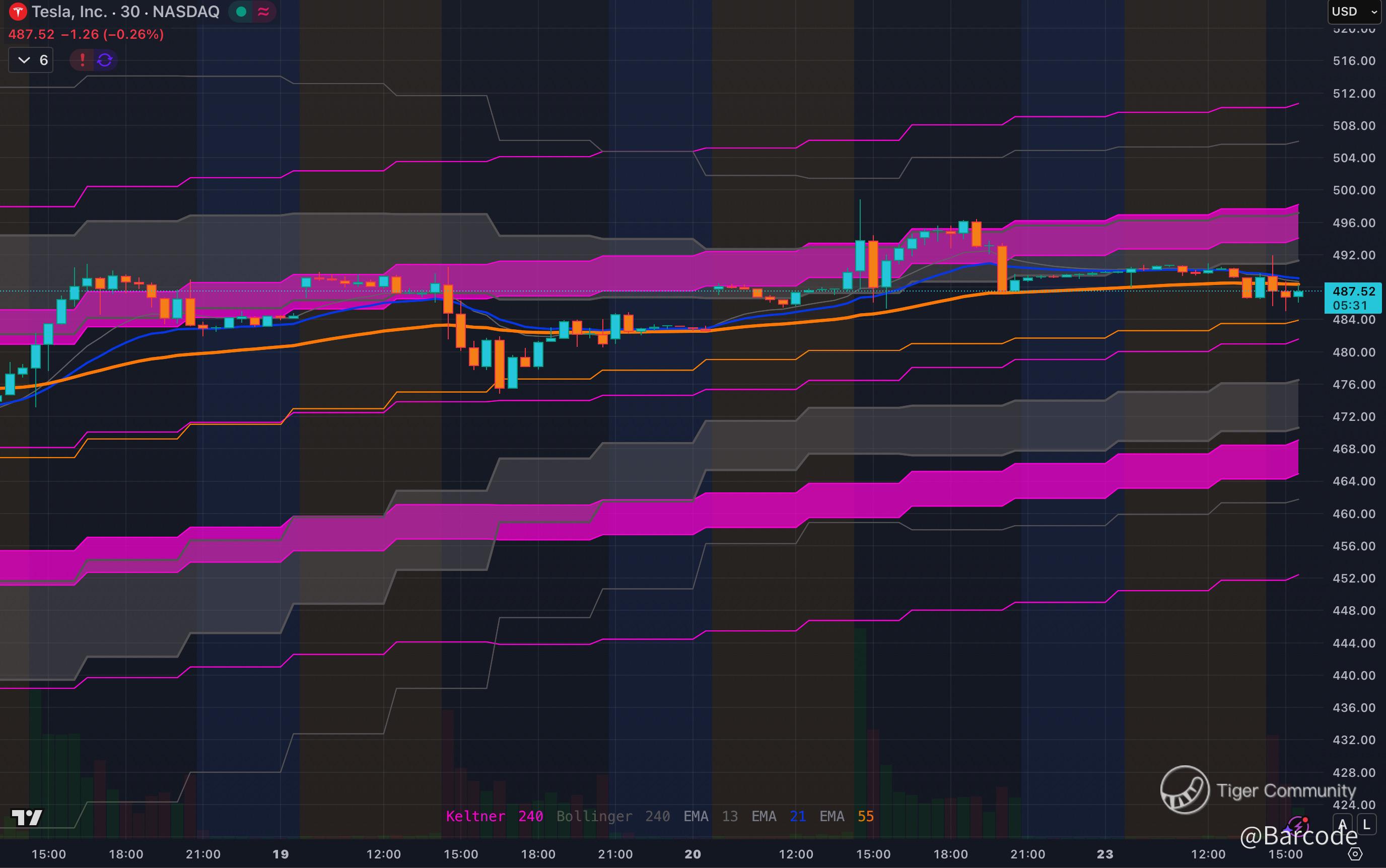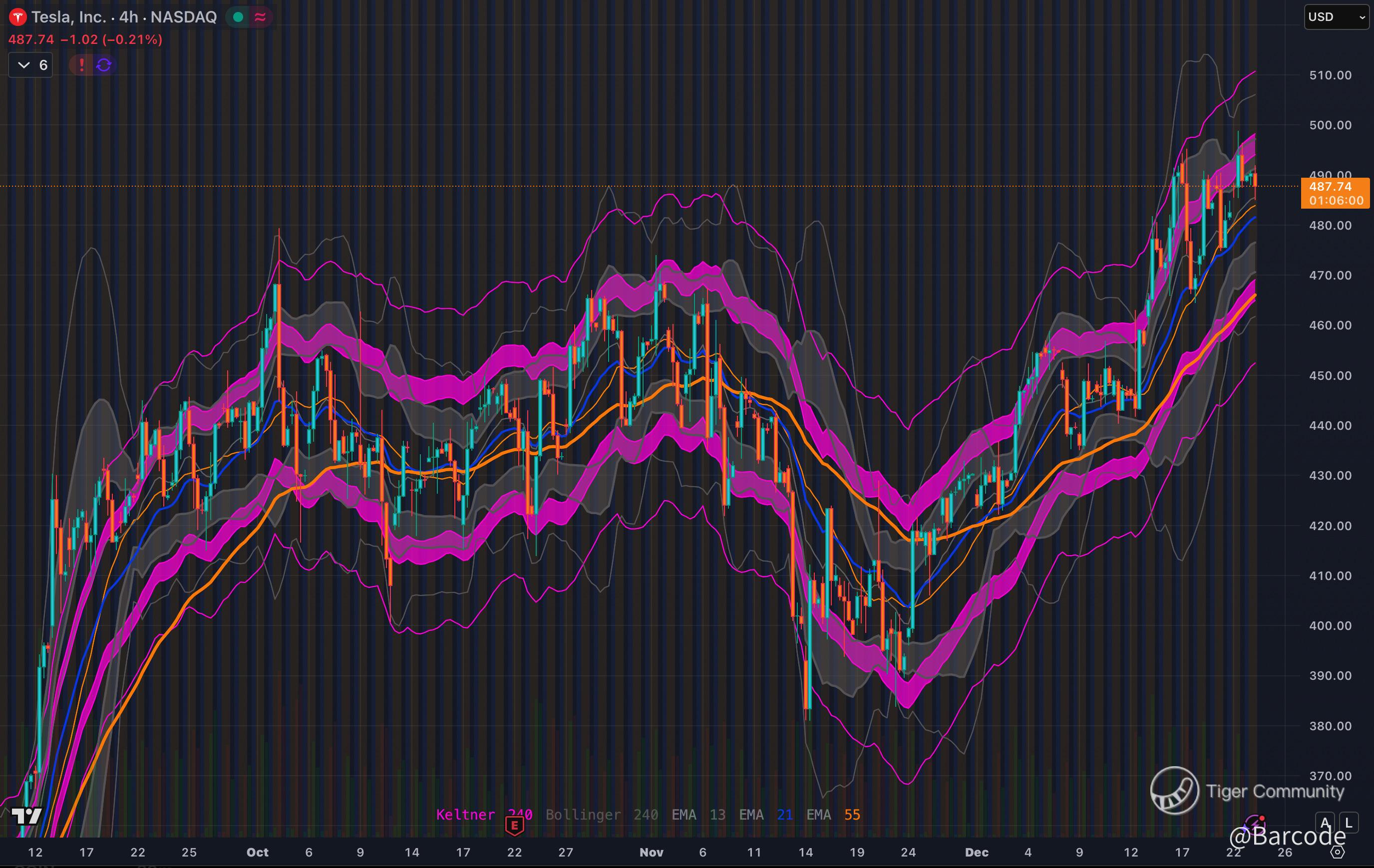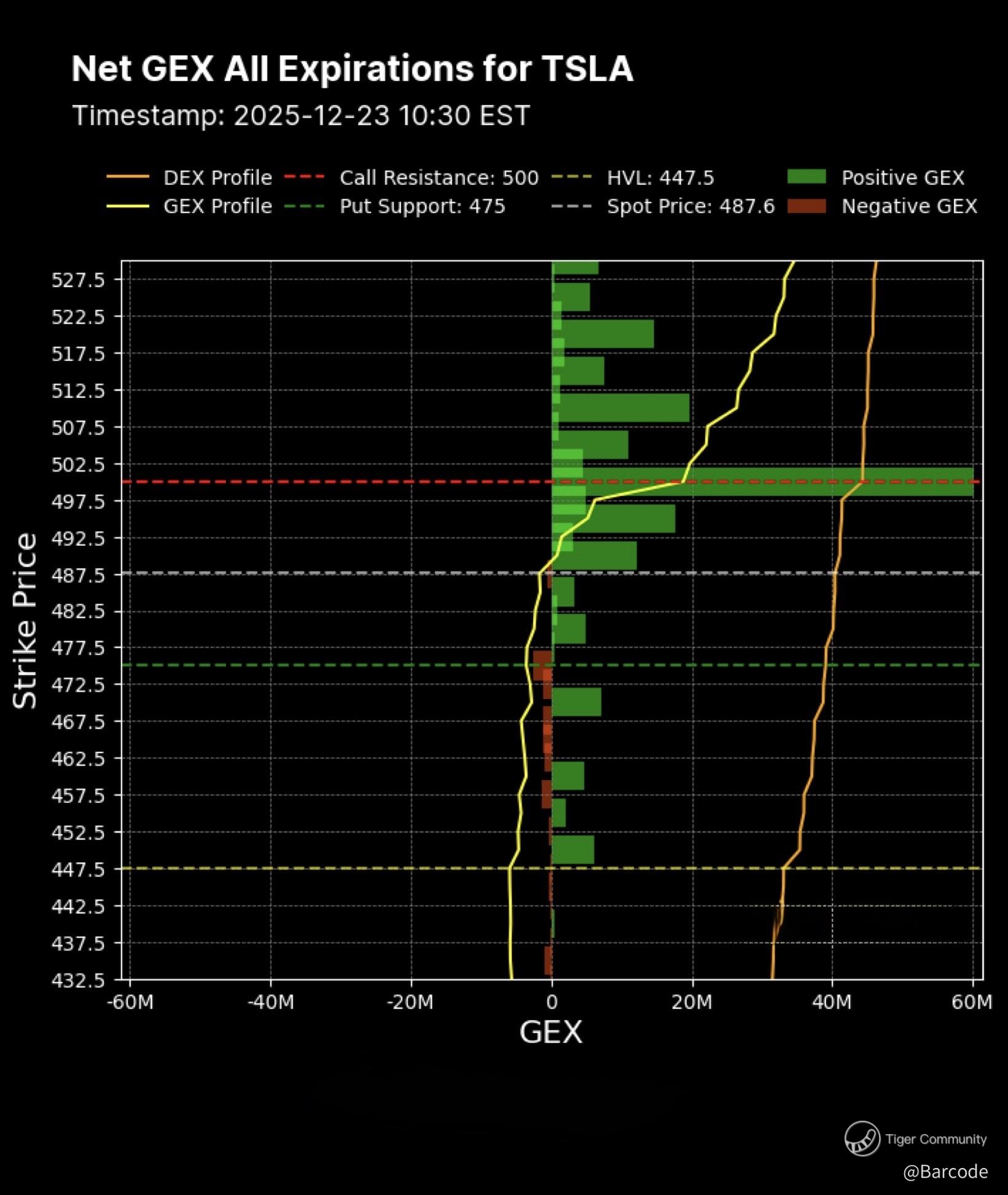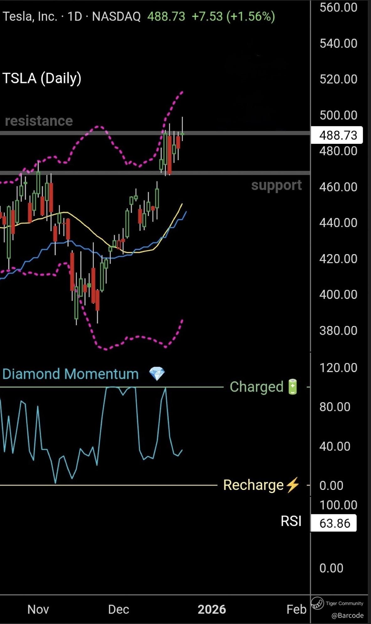 Options positioning continues to reinforce price magnetism. Danielle Shea has stated that TSLA is primed for continuation after breaking an ATH with strong volume. The $500 strike represents a dense open-interest node that acts as a magnetic zone rather than a ceiling. A decisive, high-volume break through $500 increases the probability of accelerated price discovery toward $520 and potentially $550 as dealer hedging dynamics flip. The takeaway is structural, not tactical. Dense positioning increases the odds of compression before expansion.