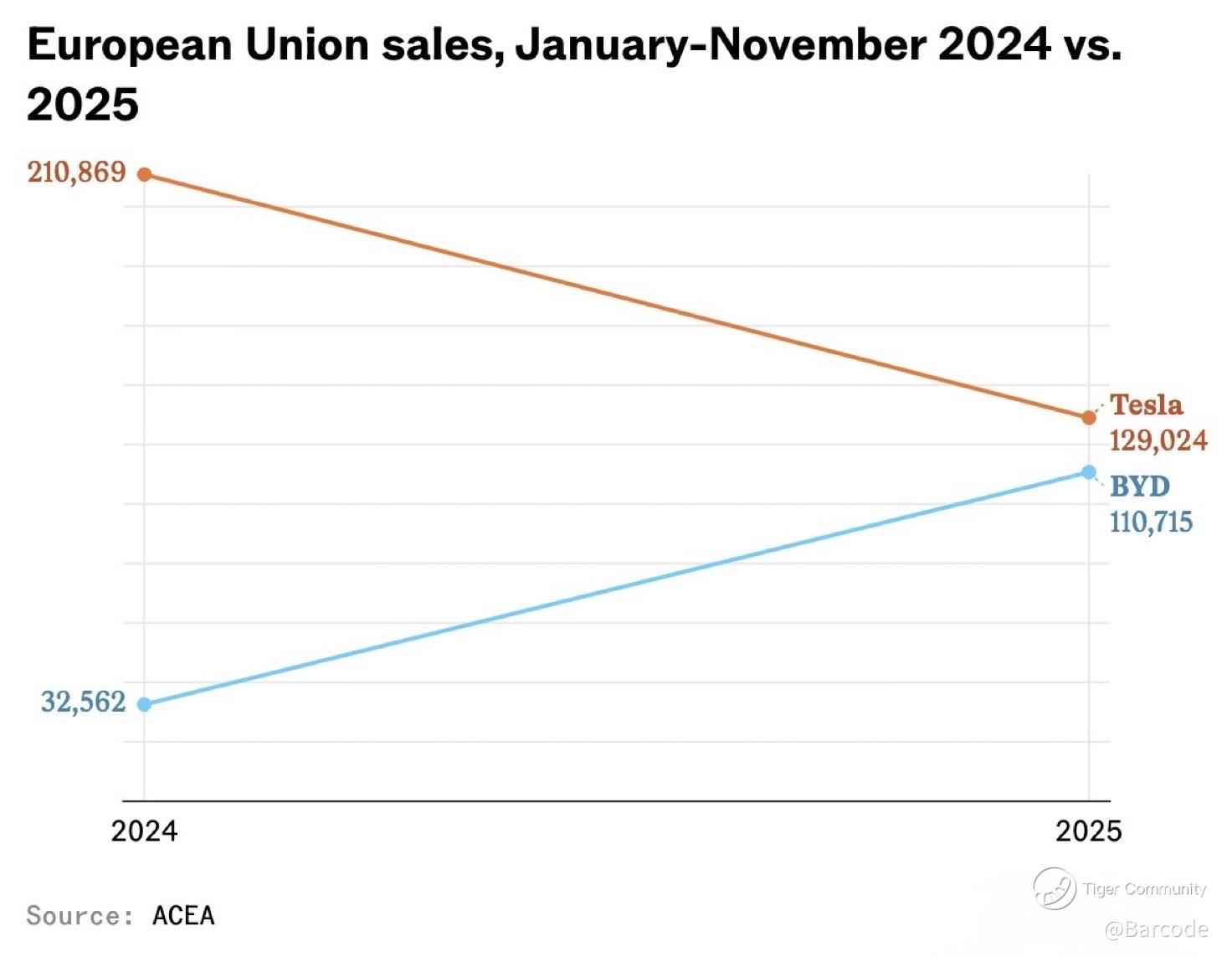Europe remains a clear narrative headwind. EU data shows TSLA sales down 39% year on year, while BYD is up 240% over the same period, with the broader EU EV market growing 28%. This divergence matters for margins and sentiment. It is not about EV demand. It is about competitive dynamics and pricing pressure.