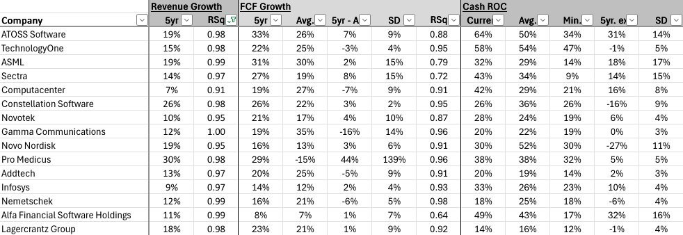 $Technology One, Ltd.(THNOF)$ $ASML Holding NV(ASML)$ $SECTRA AKTIEBOLAG(SCTAY)$ $Computacenter Plc(CUUCF)$ $Constellation Software, Inc.(CNSWY)$ $Novo-Nordisk A/S(NVO)$ $GAMMA COMMUNICATIONS PLC(GAMCF)$ $Pro Medicus, Ltd.(PMDIY)$ $Addtech AB(ADDTF)$ $Infosys(INFY)$ $Nemetschek AG(NEMTF)$ $Alfa Financial Software Holdings Ltd(AFLQF)$