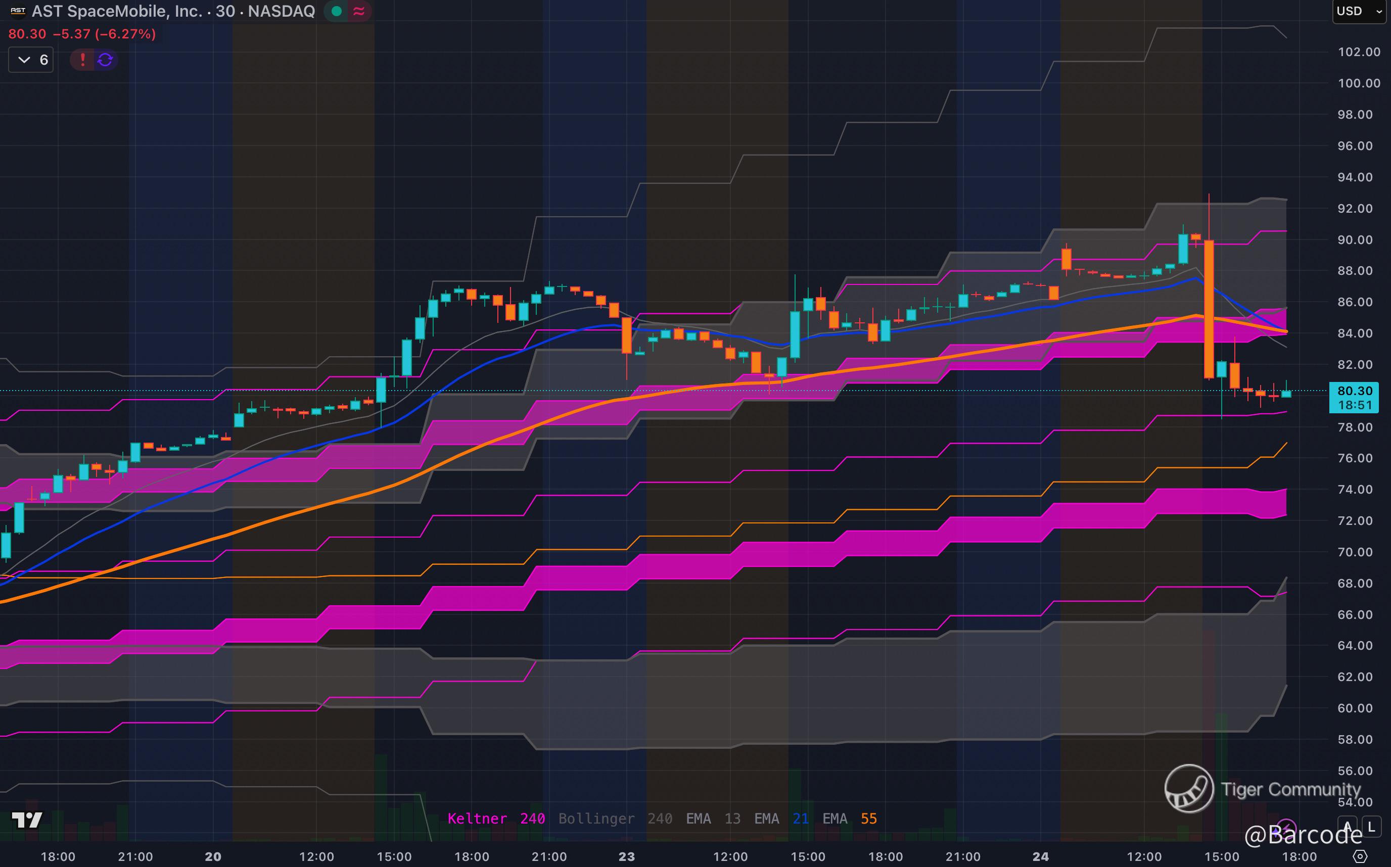 The pullback followed a tag of the upper Keltner and Bollinger bands near the $92 volatility pocket. What followed is a mean reversion toward the $85 pocket, not distribution. EMA 55 continues to slope higher. The $78 volatility pocket remains the key demand shelf. As long as that holds, the primary trend is intact.