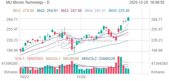 MU closed at $286.68 on Dec 25, surging +3.77% (+$10.41). The stock is just $2.62 below its intraday 52-week high of $289.30.