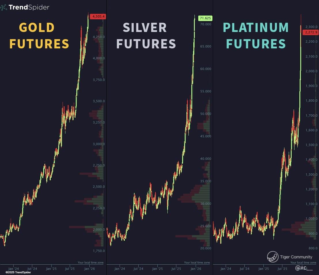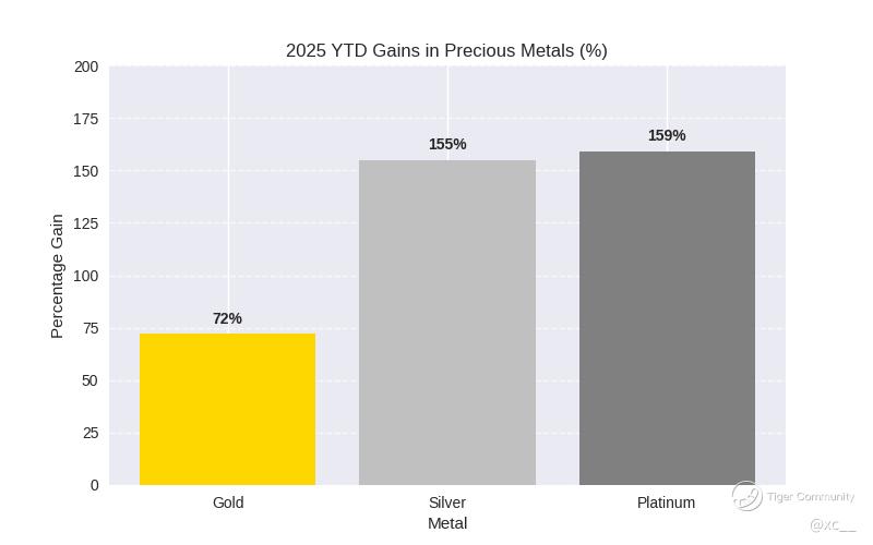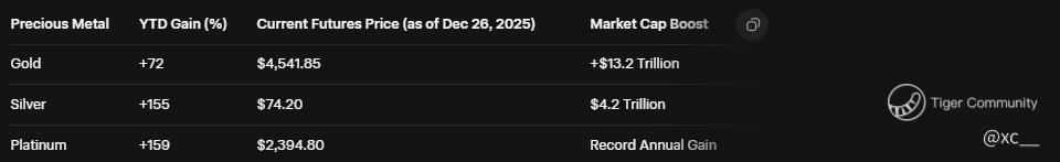 Buckle up, folks β the precious metals market is delivering a blockbuster show that's rewriting history books right before our eyes! π Gold futures have skyrocketed a jaw-dropping +72% year-to-date, ballooning its market cap by an astounding $13.2 trillion this year alone. That's not just growth; that's a wealth explosion! π Meanwhile, silver has catapulted itself into the spotlight as the third largest asset globally, surging +155% YTD and hitting a whopping $4.2 trillion valuation. π² And don't sleep on platinum β it's blasting off with a record-smashing +159% gain, marking its biggest annual leap ever tracked. These aren't just numbers; they're seismic shifts echoing the wild inflation days of 1979 when CPI hit double digits. π