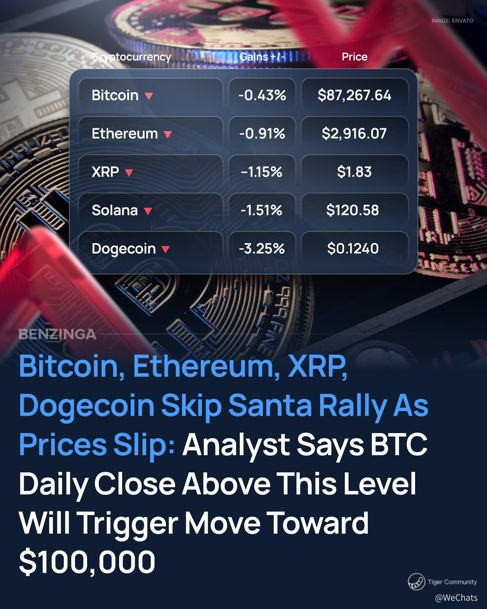 The Christmas miracle traders were hoping for didnât arrive. Instead of a breakout to $90K, Bitcoin ($BTC) got rejected at $88,500 and slipped back below $87,000, dragging the rest of the market with it. While stock futures quietly inched higher, crypto found itself stuck in the mud.
