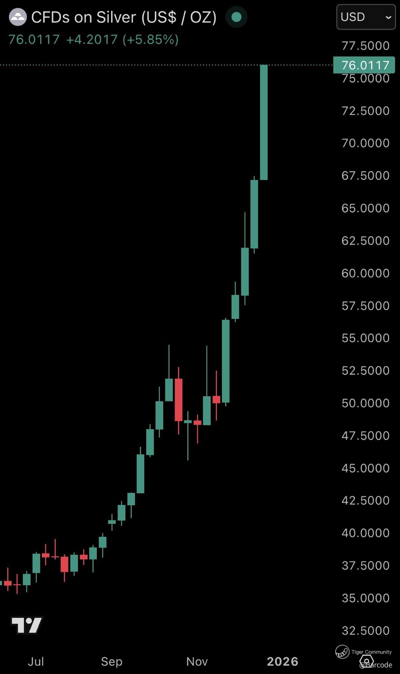 Silver is now up more than 160% in 2025, and the key detail is not the magnitude, it is the behaviour. Price is accelerating rather than mean reverting, a classic signal that an asset has shifted from trend into repricing.