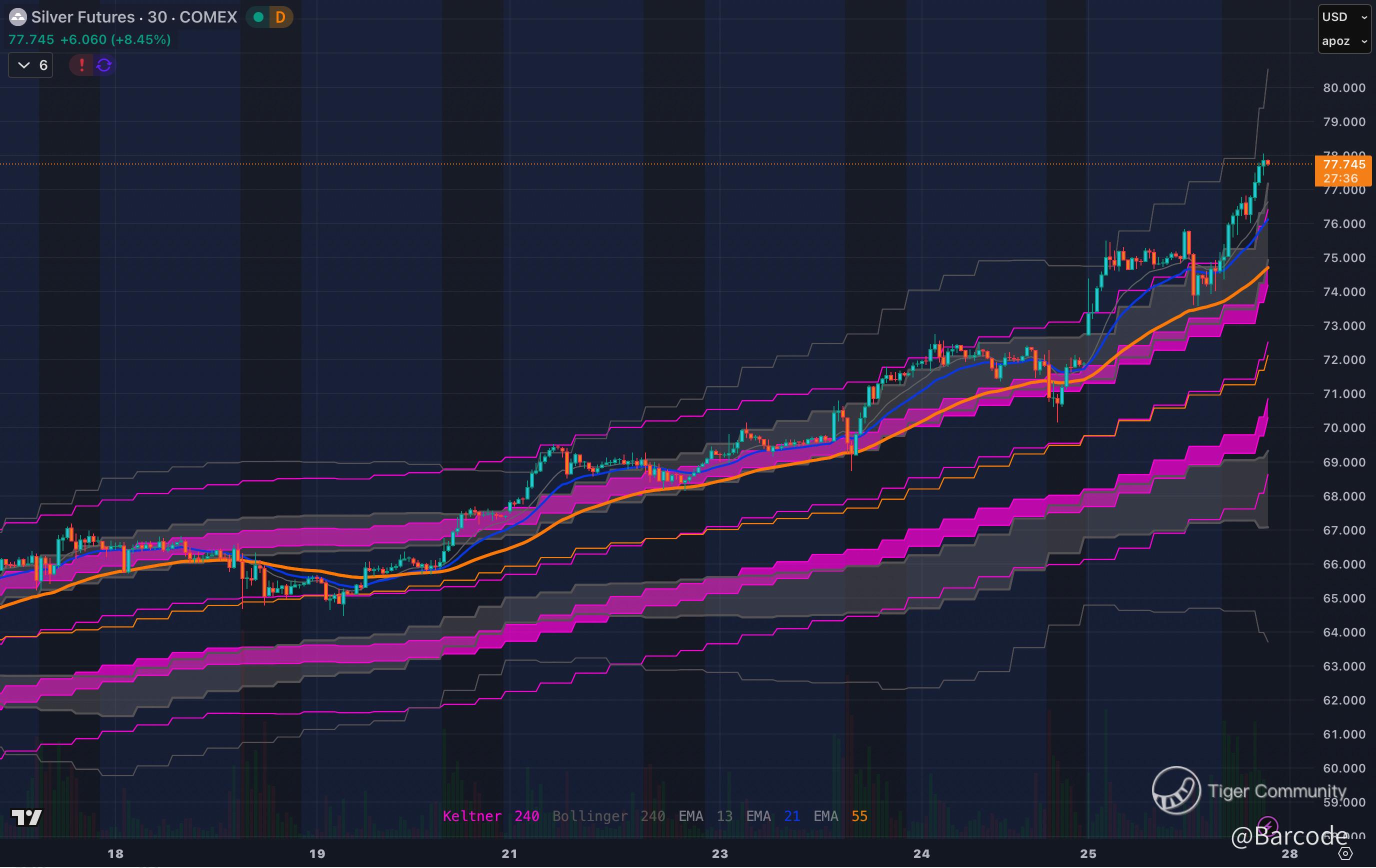 Lower timeframe structure confirms it. On the 30-minute silver chart, price is riding the upper Keltner channel, holding above rising EMAs, with volatility expanding rather than compressing. Pullbacks are shallow and quickly absorbed. That is demand overwhelming available supply, not distribution.