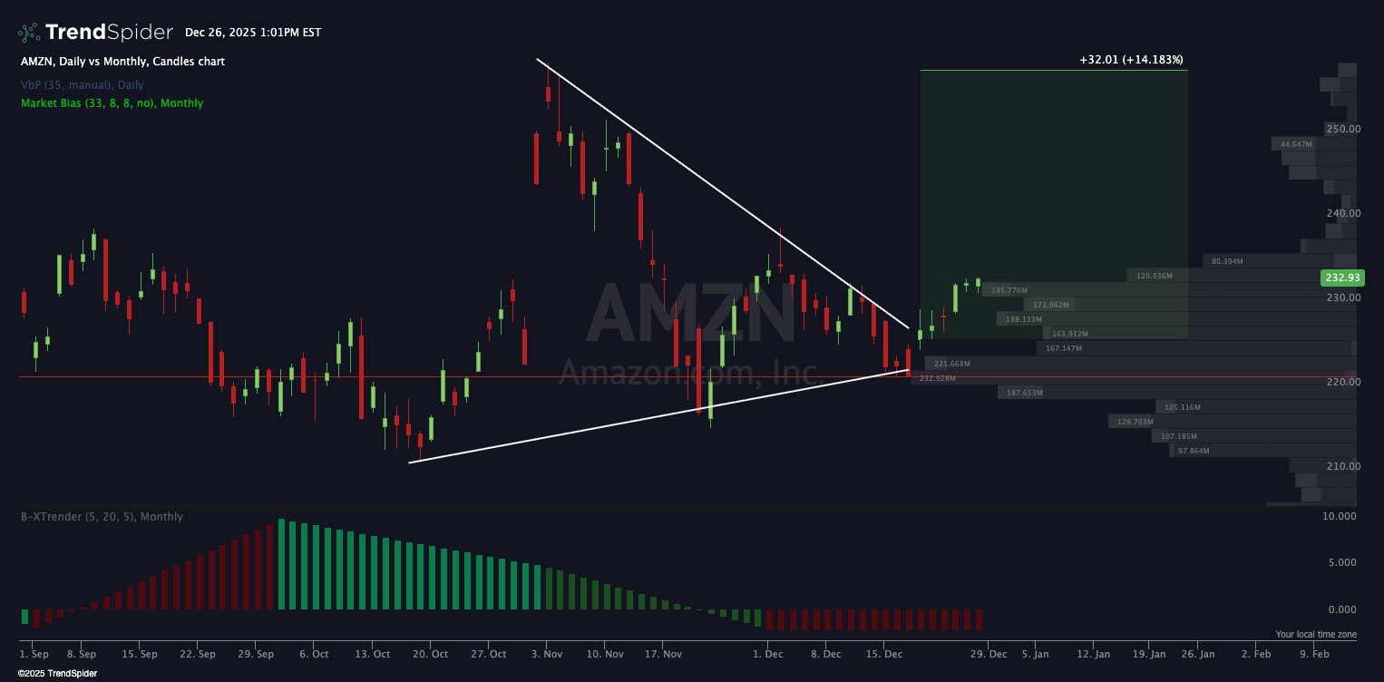 AMZN is breaking out of the wedge we called last week.