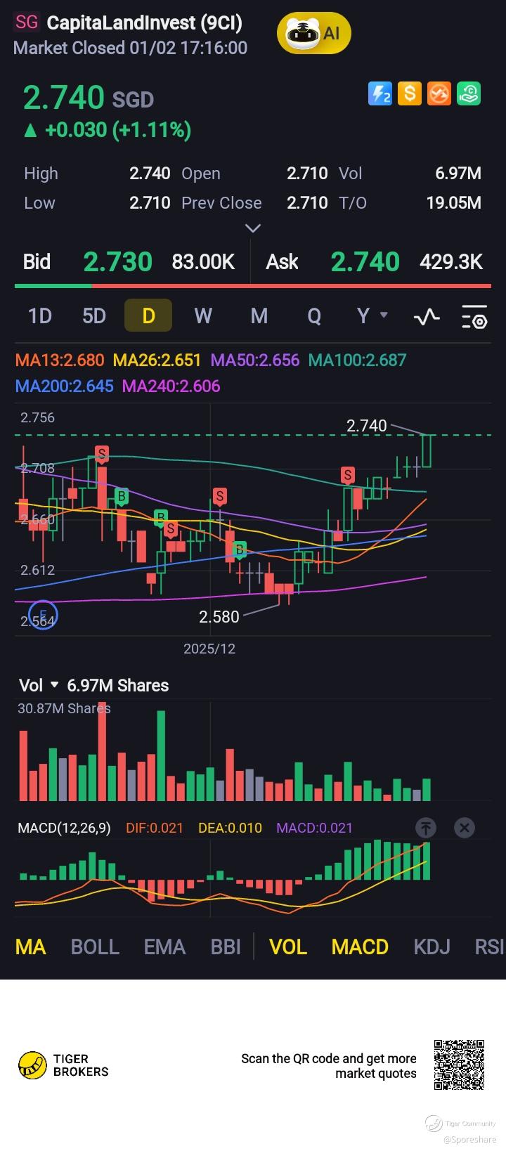 CapLand Investment - She is gaining strength likely to test 2.72 . A nice breakout smoothly plus good volume we may see her rising up further towards 2.82 and above !