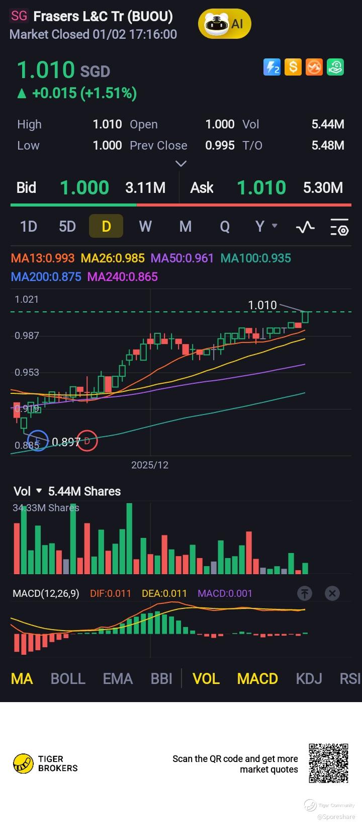 Frasers L&C Tr - Awesome, finally 1.01 is here. Likely to continue to trend higher!