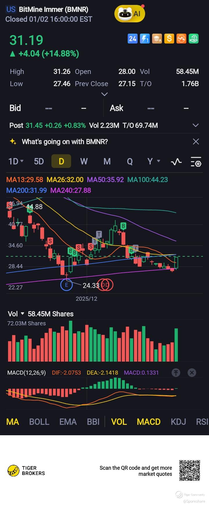 $BitMine Immersion Technologies Inc.(BMNR)$ A long and wide Green candlesticks plus high volume this is rather bullish! Closed higher at 31+ likely to continue to trend higher towards 35 than 38. ETH closed higher at 3125, likely to rise up to test 3350! Not a call to buy or sell! Please do your own due diligence!