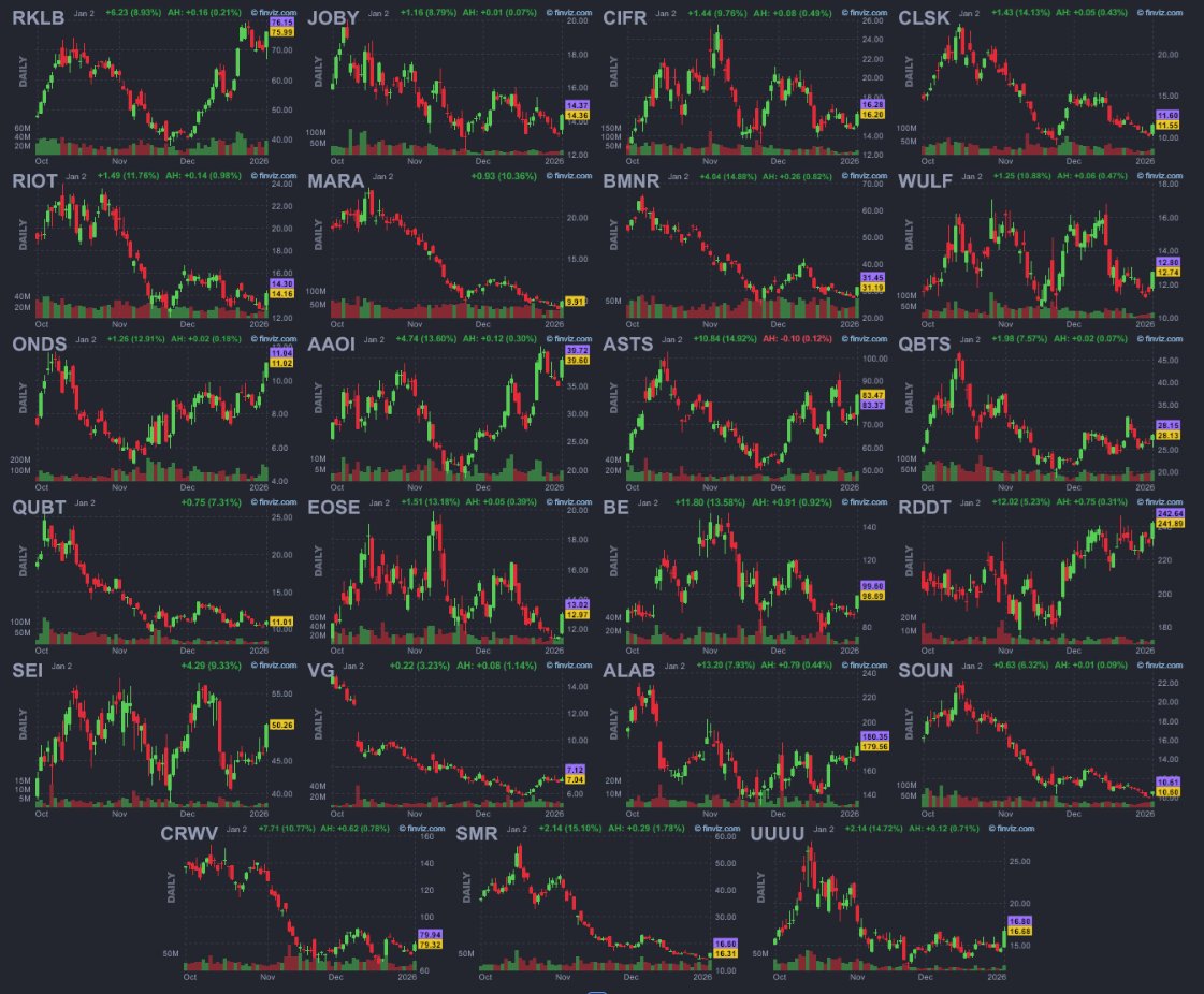 $Rocket Lab USA, Inc.(RKLB)$ $Joby Aviation, Inc.(JOBY)$ $Cipher Mining Inc.(CIFR)$ $CleanSpark, Inc.(CLSK)$ $Riot Platforms(RIOT)$ $MARA Holdings(MARA)$ $BitMine Immersion Technologies Inc.(BMNR)$ $TeraWulf Inc.(WULF)$ $Ondas Holdings Inc.(ONDS)$ $Applied Optoelectronics(AAOI)$ $AST SpaceMobile, Inc.(ASTS)$